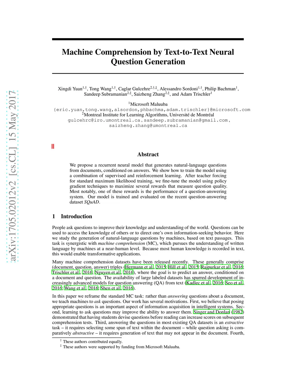 Machine Comprehension by Text-to-Text Neural Question Generation