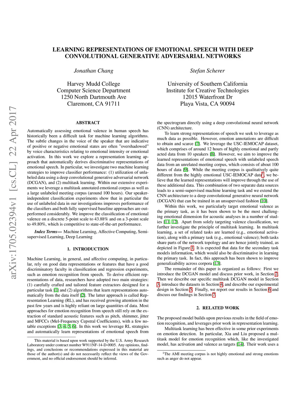 Automatically assessing emotional valence in human speech has historically been a difficult task for machine learning algorithms. The subtle changes in the voice of the speaker that are indicative of positive or negative emotional states are often "overshadowed" by voice characteristics relating to emotional intensity or emotional activation. In this work we explore a representation learning approach that automatically derives discriminative representations of emotional speech. In particular, we investigate two machine learning strategies to improve classifier performance: (1) utilization of unlabeled data using a deep convolutional generative adversarial network (DCGAN), and (2) multitask learning. Within our extensive experiments we leverage a multitask annotated emotional corpus as well as a large unlabeled meeting corpus (around 100 hours). Our speaker-independent classification experiments show that in particular the use of unlabeled data in our investigations improves performance of the classifiers and both fully supervised baseline approaches are outperformed considerably. We improve the classification of emotional valence on a discrete 5-point scale to 43.88% and on a 3-point scale to 49.80%, which is competitive to state-of-the-art performance.
