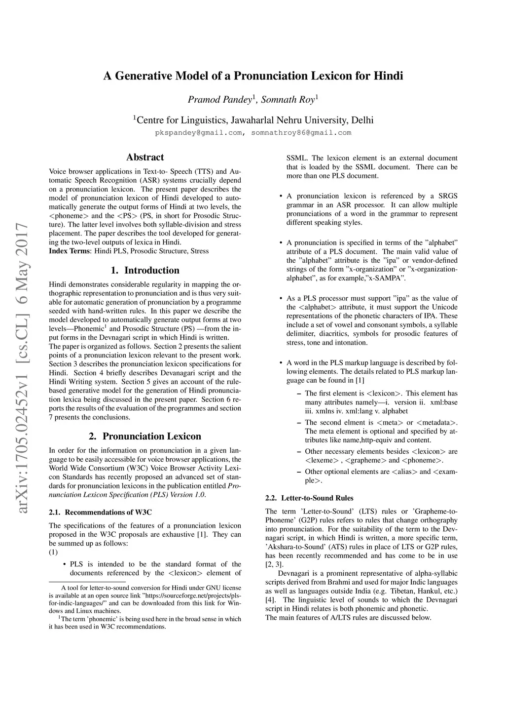 Voice browser applications in Text-to- Speech (TTS) and Automatic Speech Recognition (ASR) systems crucially depend on a pronunciation lexicon. The present paper describes the model of pronunciation lexicon of Hindi developed to automatically generate the output forms of Hindi at two levels, the <phoneme> and the <PS> (PS, in short for Prosodic Structure). The latter level involves both syllable-division and stress placement. The paper describes the tool developed for generating the two-level outputs of lexica in Hindi.