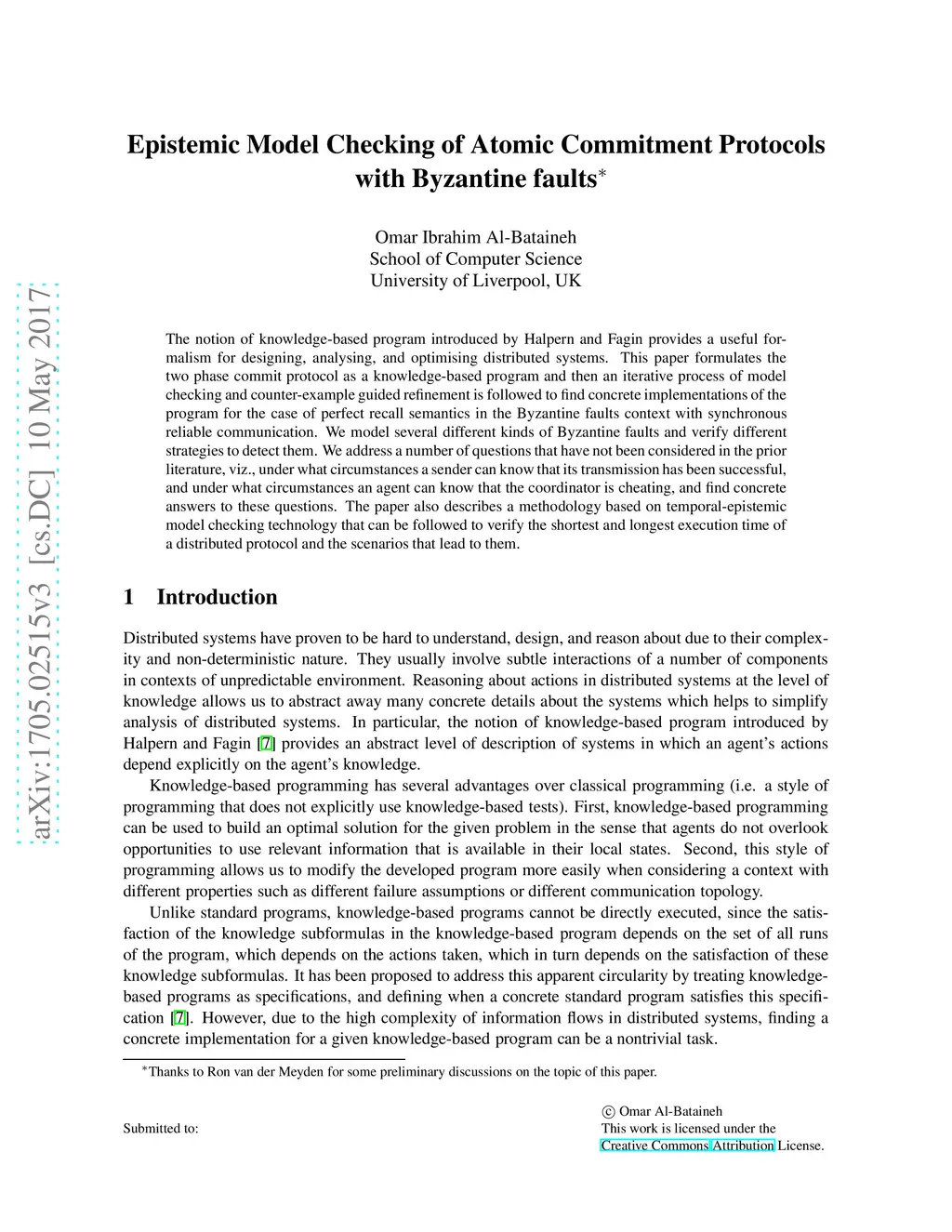 The notion of knowledge-based program introduced by Halpern and Fagin provides a useful formalism for designing, analysing, and optimising distributed systems. This paper formulates the two phase commit protocol as a knowledge-based program and then an iterative process of model checking and counter-example guided refinement is followed to find concrete implementations of the program for the case of perfect recall semantic in the Byzantine failures context with synchronous reliable communication. We model several different kinds of Byzantine failures and verify different strategies to fight and mitigate them. We address a number of questions that have not been considered in the prior literature, viz., under what circumstances a sender can know that its transmission has been successful, and under what circumstances an agent can know that the coordinator is cheating, and find concrete answers to these questions. The paper describes also a methodology based on temporal-epistemic model checking technology that can be followed to verify the shortest and longest execution time of a distributed protocol and the scenarios that lead to them.