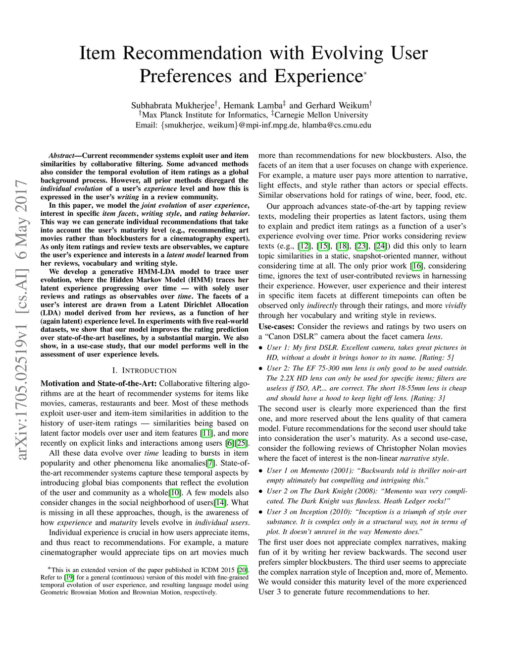 Current recommender systems exploit user and item similarities by collaborative filtering. Some advanced methods also consider the temporal evolution of item ratings as a global background process. However, all prior methods disregard the individual evolution of a user's experience level and how this is expressed in the user's writing in a review community. In this paper, we model the joint evolution of user experience, interest in specific item facets, writing style, and rating behavior. This way we can generate individual recommendations that take into account the user's maturity level (e.g., recommending art movies rather than blockbusters for a cinematography expert). As only item ratings and review texts are observables, we capture the user's experience and interests in a latent model learned from her reviews, vocabulary and writing style. We develop a generative HMM-LDA model to trace user evolution, where the Hidden Markov Model (HMM) traces her latent experience progressing over time -- with solely user reviews and ratings as observables over time. The facets of a user's interest are drawn from a Latent Dirichlet Allocation (LDA) model derived from her reviews, as a function of her (again latent) experience level. In experiments with five real-world datasets, we show that our model improves the rating prediction over state-of-the-art baselines, by a substantial margin. We also show, in a use-case study, that our model performs well in the assessment of user experience levels.