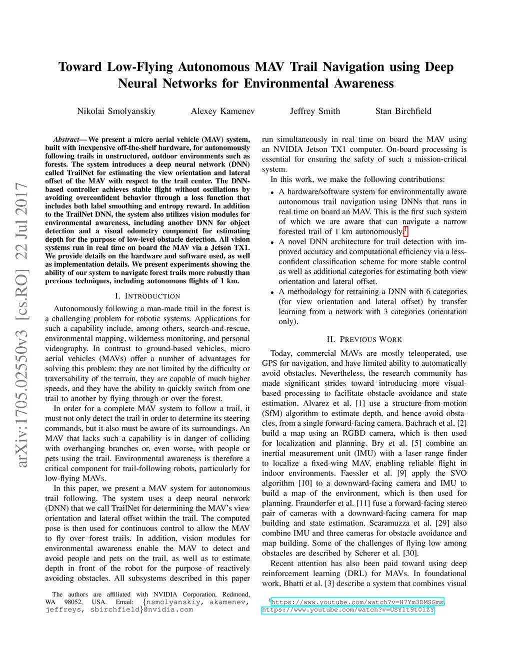 We present a micro aerial vehicle (MAV) system, built with inexpensive off-the-shelf hardware, for autonomously following trails in unstructured, outdoor environments such as forests. The system introduces a deep neural network (DNN) called TrailNet for estimating the view orientation and lateral offset of the MAV with respect to the trail center. The DNN-based controller achieves stable flight without oscillations by avoiding overconfident behavior through a loss function that includes both label smoothing and entropy reward. In addition to the TrailNet DNN, the system also utilizes vision modules for environmental awareness, including another DNN for object detection and a visual odometry component for estimating depth for the purpose of low-level obstacle detection. All vision systems run in real time on board the MAV via a Jetson TX1. We provide details on the hardware and software used, as well as implementation details. We present experiments showing the ability of our system to navigate forest trails more robustly than previous techniques, including autonomous flights of 1 km.