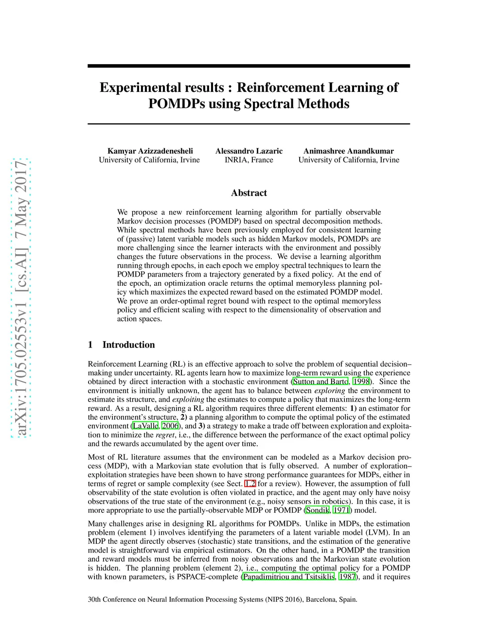 Experimental results : Reinforcement Learning of POMDPs using Spectral