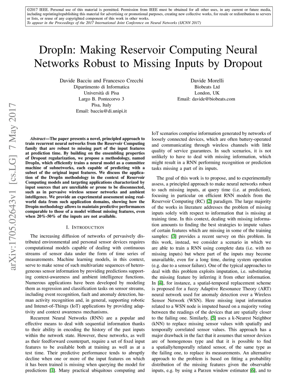 The paper presents a novel, principled approach to train recurrent neural networks from the Reservoir Computing family that are robust to missing part of the input features at prediction time. By building on the ensembling properties of Dropout regularization, we propose a methodology, named DropIn, which efficiently trains a neural model as a committee machine of subnetworks, each capable of predicting with a subset of the original input features. We discuss the application of the DropIn methodology in the context of Reservoir Computing models and targeting applications characterized by input sources that are unreliable or prone to be disconnected, such as in pervasive wireless sensor networks and ambient intelligence. We provide an experimental assessment using real-world data from such application domains, showing how the Dropin methodology allows to maintain predictive performances comparable to those of a model without missing features, even when 20\%-50\% of the inputs are not available.