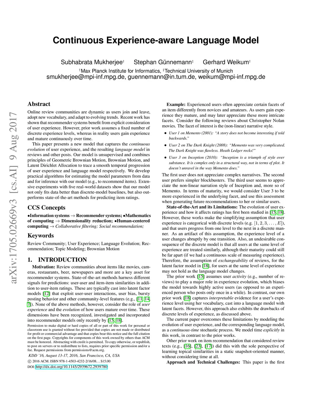 Online review communities are dynamic as users join and leave, adopt new vocabulary, and adapt to evolving trends. Recent work has shown that recommender systems benefit from explicit consideration of user experience. However, prior work assumes a fixed number of discrete experience levels, whereas in reality users gain experience and mature continuously over time. This paper presents a new model that captures the continuous evolution of user experience, and the resulting language model in reviews and other posts. Our model is unsupervised and combines principles of Geometric Brownian Motion, Brownian Motion, and Latent Dirichlet Allocation to trace a smooth temporal progression of user experience and language model respectively. We develop practical algorithms for estimating the model parameters from data and for inference with our model (e.g., to recommend items). Extensive experiments with five real-world datasets show that our model not only fits data better than discrete-model baselines, but also outperforms state-of-the-art methods for predicting item ratings.