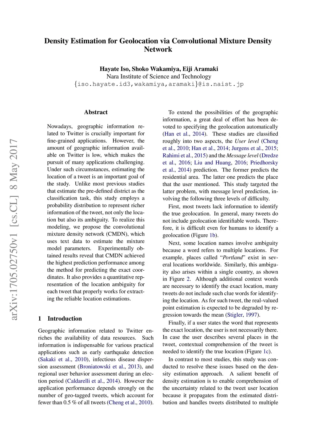 Nowadays, geographic information related to Twitter is crucially important for fine-grained applications. However, the amount of geographic information avail- able on Twitter is low, which makes the pursuit of many applications challenging. Under such circumstances, estimating the location of a tweet is an important goal of the study. Unlike most previous studies that estimate the pre-defined district as the classification task, this study employs a probability distribution to represent richer information of the tweet, not only the location but also its ambiguity. To realize this modeling, we propose the convolutional mixture density network (CMDN), which uses text data to estimate the mixture model parameters. Experimentally obtained results reveal that CMDN achieved the highest prediction performance among the method for predicting the exact coordinates. It also provides a quantitative representation of the location ambiguity for each tweet that properly works for extracting the reliable location estimations.
