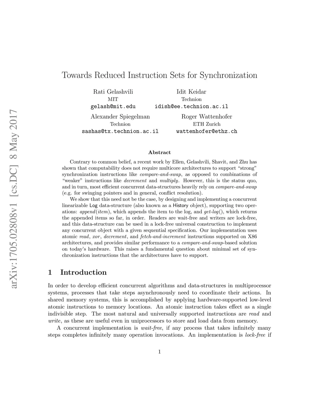 Contrary to common belief, a recent work by Ellen, Gelashvili, Shavit, and Zhu has shown that computability does not require multicore architectures to support "strong" synchronization instructions like compare-and-swap, as opposed to combinations of "weaker" instructions like decrement and multiply. However, this is the status quo, and in turn, most efficient concurrent data-structures heavily rely on compare-and-swap (e.g. for swinging pointers and in general, conflict resolution). We show that this need not be the case, by designing and implementing a concurrent linearizable Log data-structure (also known as a History object), supporting two operations: append(item), which appends the item to the log, and get-log(), which returns the appended items so far, in order. Readers are wait-free and writers are lock-free, and this data-structure can be used in a lock-free universal construction to implement any concurrent object with a given sequential specification. Our implementation uses atomic read, xor, decrement, and fetch-and-increment instructions supported on X86 architectures, and provides similar performance to a compare-and-swap-based solution on today's hardware. This raises a fundamental question about minimal set of synchronization instructions that the architectures have to support.