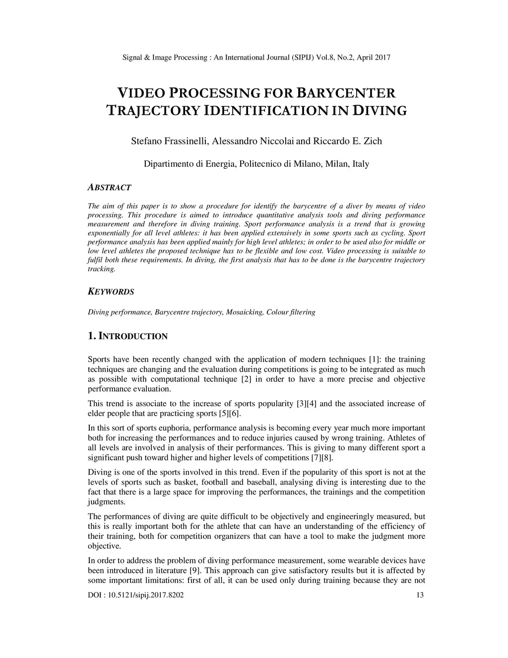 The aim of this paper is to show a procedure for identify the barycentre of a diver by means of video processing. This procedure is aimed to introduce quantitative analysis tools and diving performance measurement and therefore in diving training. Sport performance analysis is a trend that is growing exponentially for all level athletes: it has been applied extensively in some sports such as cycling. Sport performance analysis has been applied mainly for high level athletes; in order to be used also for middle or low level athletes the proposed technique has to be flexible and low cost. Video processing is suitable to fulfil both these requirements. In diving, the first analysis that has to be done is the barycentre trajectory tracking.