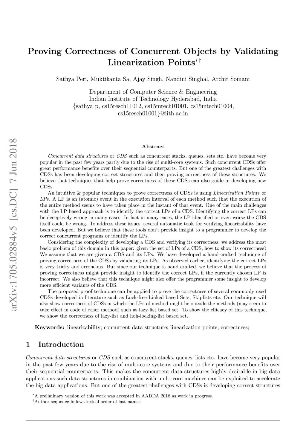 Concurrent data structures or CDS such as concurrent stacks, queues, sets etc. have become very popular in the past few years partly due to the rise of multi-core systems. But one of the greatest challenges with CDSs has been developing correct structures and then proving the correctness of these structures. We believe that techniques that help prove the correctness of these CDSs can also guide in developing new CDSs. An intuitive technique to prove the correctness of CDSs is using Linearization Points or LPs. An LP is an atomic event in the execution interval of each method such that the execution of the entire method seems to have taken place in the instant of that event. One of the main challenges with the LP based approach is to identify the correct LPs of a CDS. Identifying the correct LPs can be deceptively wrong in many cases. In fact, in many cases, the LP identified or even worse the CDS itself could be wrong. To address these issues, several automatic tools for verifying linearizability have been developed. But we believe that these tools don't provide insight to a programmer to develop the correct concurrent programs or identify the LPs. Considering the complexity of developing a CDS and verifying its correctness, we address the most basic problem of this domain in this paper: given the set of LPs of a CDS, how to show its correctness? We assume that we are given a CDS and its LPs. We have developed a hand-crafted technique of proving the correctness of the CDS by validating its LPs. As observed earlier, identifying the correct LPs is very tricky and erroneous. But since our technique is hand-crafted, we believe that the process of proving correctness might provide insight to identify the correct LPs, if the currently chosen LP is incorrect. We also believe that this technique might also offer the programmer some insight to develop more efficient variants of the CDS.