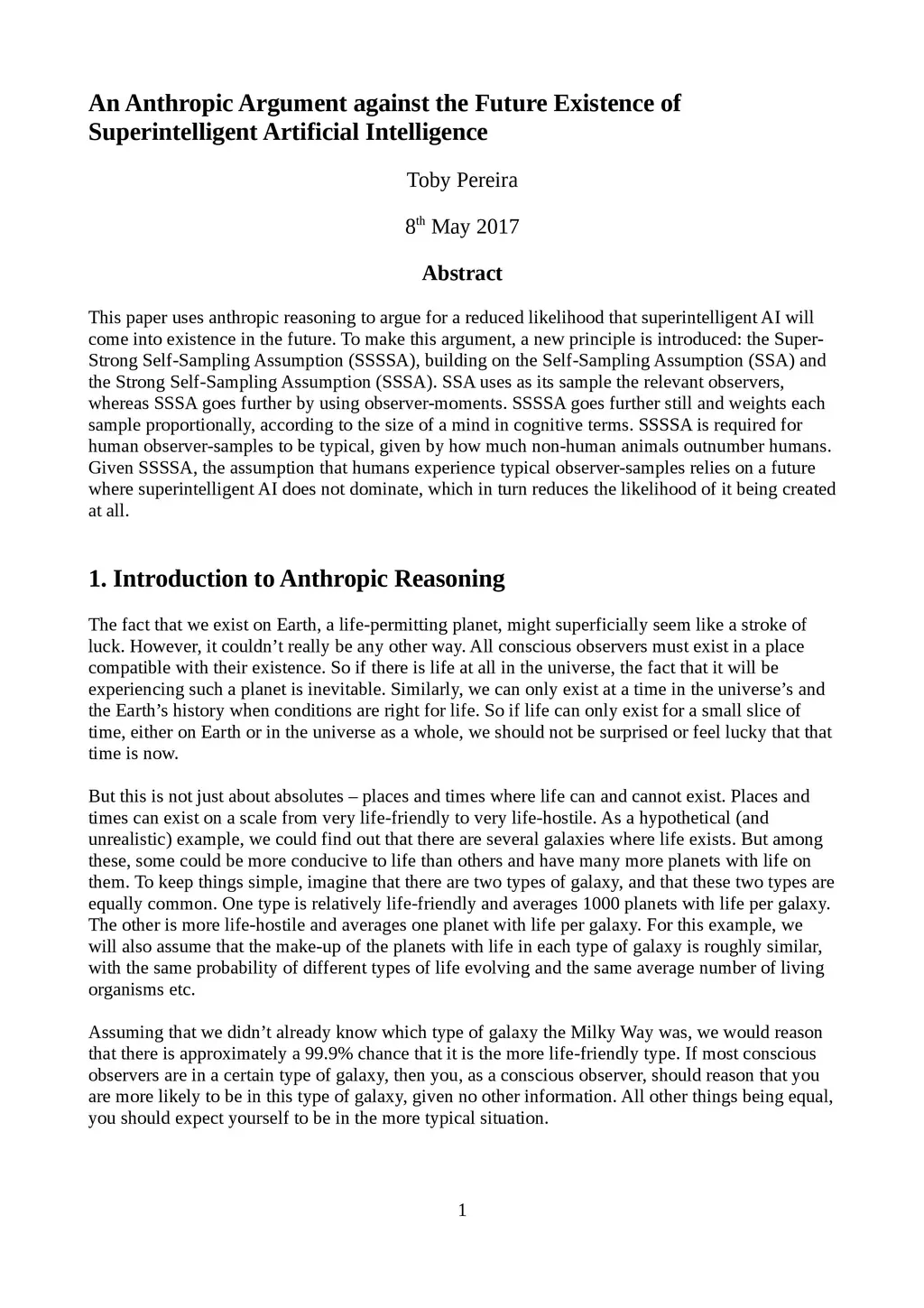 This paper uses anthropic reasoning to argue for a reduced likelihood that superintelligent AI will come into existence in the future. To make this argument, a new principle is introduced: the Super-Strong Self-Sampling Assumption (SSSSA), building on the Self-Sampling Assumption (SSA) and the Strong Self-Sampling Assumption (SSSA). SSA uses as its sample the relevant observers, whereas SSSA goes further by using observer-moments. SSSSA goes further still and weights each sample proportionally, according to the size of a mind in cognitive terms. SSSSA is required for human observer-samples to be typical, given by how much non-human animals outnumber humans. Given SSSSA, the assumption that humans experience typical observer-samples relies on a future where superintelligent AI does not dominate, which in turn reduces the likelihood of it being created at all.