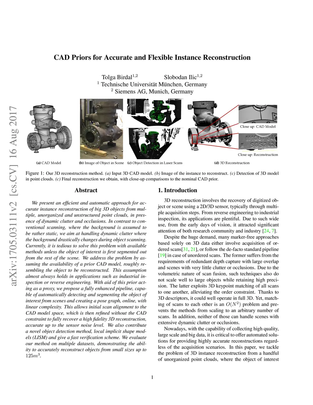 We present an efficient and automatic approach for accurate reconstruction of instances of big 3D objects from multiple, unorganized and unstructured point clouds, in presence of dynamic clutter and occlusions. In contrast to conventional scanning, where the background is assumed to be rather static, we aim at handling dynamic clutter where background drastically changes during the object scanning. Currently, it is tedious to solve this with available methods unless the object of interest is first segmented out from the rest of the scene. We address the problem by assuming the availability of a prior CAD model, roughly resembling the object to be reconstructed. This assumption almost always holds in applications such as industrial inspection or reverse engineering. With aid of this prior acting as a proxy, we propose a fully enhanced pipeline, capable of automatically detecting and segmenting the object of interest from scenes and creating a pose graph, online, with linear complexity. This allows initial scan alignment to the CAD model space, which is then refined without the CAD constraint to fully recover a high fidelity 3D reconstruction, accurate up to the sensor noise level. We also contribute a novel object detection method, local implicit shape models (LISM) and give a fast verification scheme. We evaluate our method on multiple datasets, demonstrating the ability to accurately reconstruct objects from small sizes up to .