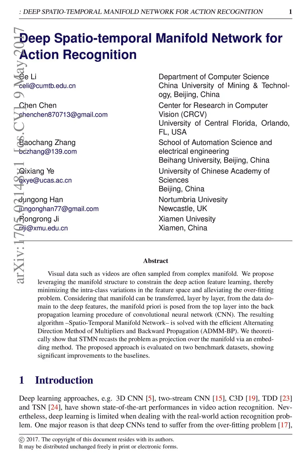 Visual data such as videos are often sampled from complex manifold. We propose leveraging the manifold structure to constrain the deep action feature learning, thereby minimizing the intra-class variations in the feature space and alleviating the over-fitting problem. Considering that manifold can be transferred, layer by layer, from the data domain to the deep features, the manifold priori is posed from the top layer into the back propagation learning procedure of convolutional neural network (CNN). The resulting algorithm --Spatio-Temporal Manifold Network-- is solved with the efficient Alternating Direction Method of Multipliers and Backward Propagation (ADMM-BP). We theoretically show that STMN recasts the problem as projection over the manifold via an embedding method. The proposed approach is evaluated on two benchmark datasets, showing significant improvements to the baselines.