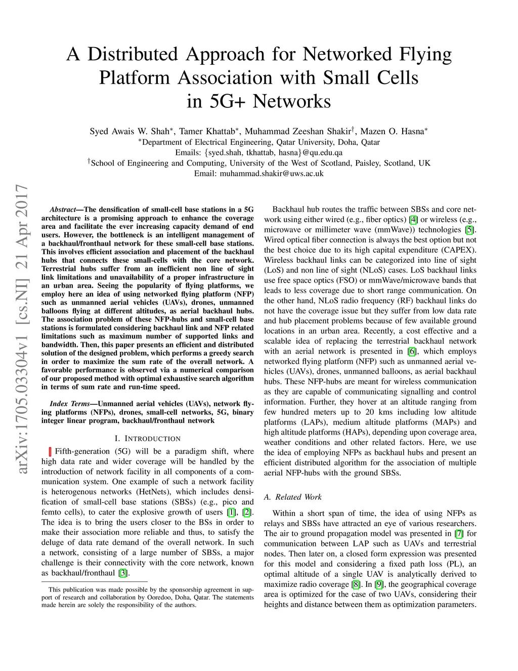 The densification of small-cell base stations in a 5G architecture is a promising approach to enhance the coverage area and facilitate the ever increasing capacity demand of end users. However, the bottleneck is an intelligent management of a backhaul/fronthaul network for these small-cell base stations. This involves efficient association and placement of the backhaul hubs that connects these small-cells with the core network. Terrestrial hubs suffer from an inefficient non line of sight link limitations and unavailability of a proper infrastructure in an urban area. Seeing the popularity of flying platforms, we employ here an idea of using networked flying platform (NFP) such as unmanned aerial vehicles (UAVs), drones, unmanned balloons flying at different altitudes, as aerial backhaul hubs. The association problem of these NFP-hubs and small-cell base stations is formulated considering backhaul link and NFP related limitations such as maximum number of supported links and bandwidth. Then, this paper presents an efficient and distributed solution of the designed problem, which performs a greedy search in order to maximize the sum rate of the overall network. A favorable performance is observed via a numerical comparison of our proposed method with optimal exhaustive search algorithm in terms of sum rate and run-time speed.