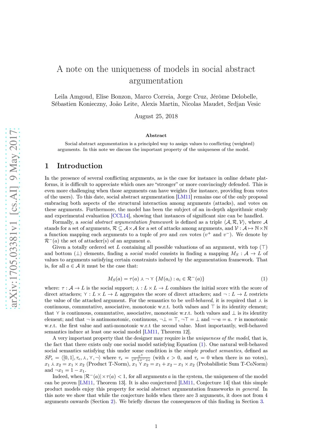 Social abstract argumentation is a principled way to assign values to conflicting (weighted) arguments. In this note we discuss the important property of the uniqueness of the model.