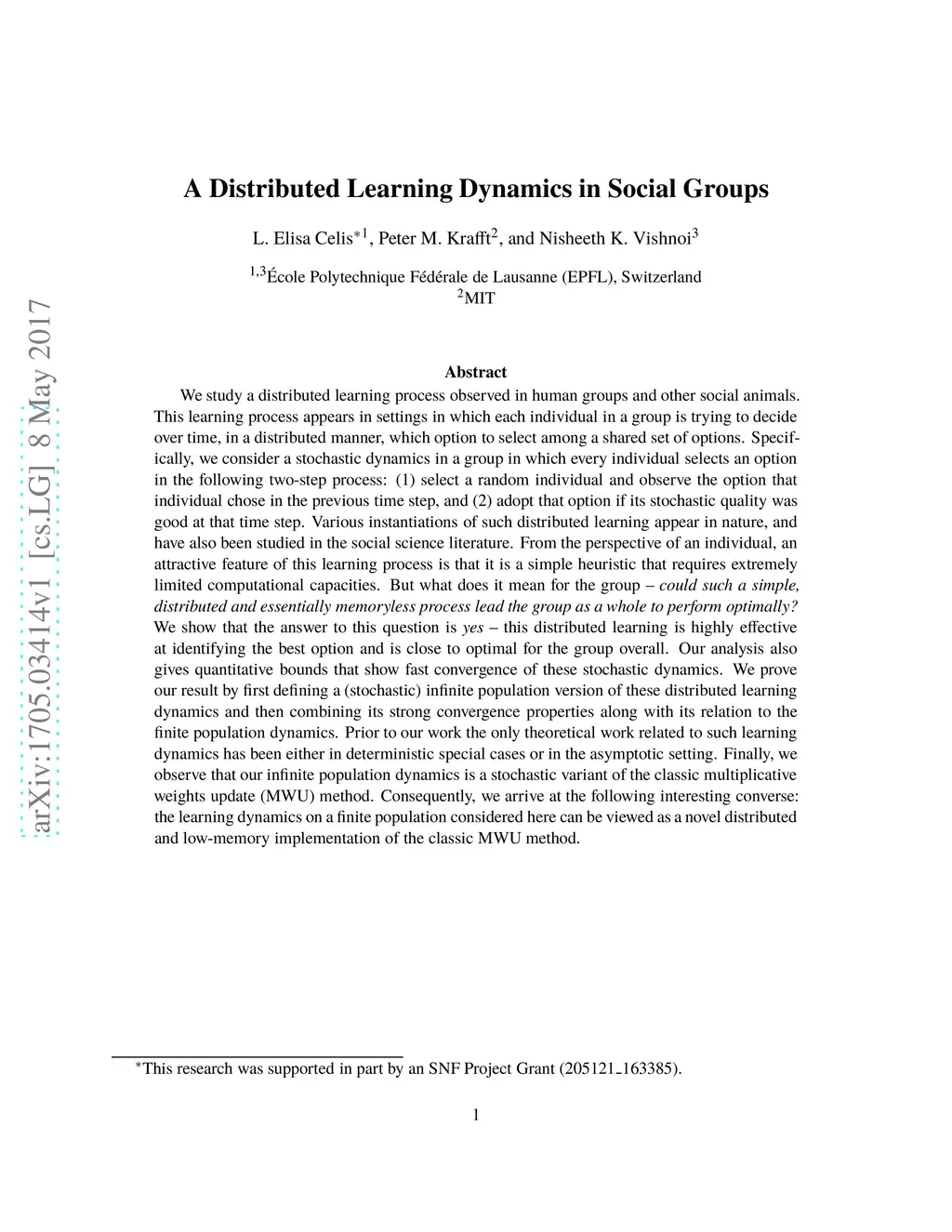 We study a distributed learning process observed in human groups and other social animals. This learning process appears in settings in which each individual in a group is trying to decide over time, in a distributed manner, which option to select among a shared set of options. Specifically, we consider a stochastic dynamics in a group in which every individual selects an option in the following two-step process: (1) select a random individual and observe the option that individual chose in the previous time step, and (2) adopt that option if its stochastic quality was good at that time step. Various instantiations of such distributed learning appear in nature, and have also been studied in the social science literature. From the perspective of an individual, an attractive feature of this learning process is that it is a simple heuristic that requires extremely limited computational capacities. But what does it mean for the group -- could such a simple, distributed and essentially memoryless process lead the group as a whole to perform optimally? We show that the answer to this question is yes -- this distributed learning is highly effective at identifying the best option and is close to optimal for the group overall. Our analysis also gives quantitative bounds that show fast convergence of these stochastic dynamics. Prior to our work the only theoretical work related to such learning dynamics has been either in deterministic special cases or in the asymptotic setting. Finally, we observe that our infinite population dynamics is a stochastic variant of the classic multiplicative weights update (MWU) method. Consequently, we arrive at the following interesting converse: the learning dynamics on a finite population considered here can be viewed as a novel distributed and low-memory implementation of the classic MWU method.