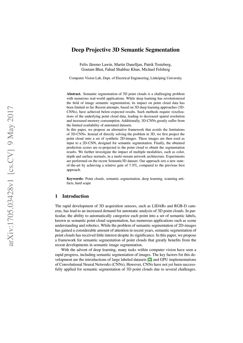 Semantic segmentation of 3D point clouds is a challenging problem with numerous real-world applications. While deep learning has revolutionized the field of image semantic segmentation, its impact on point cloud data has been limited so far. Recent attempts, based on 3D deep learning approaches (3D-CNNs), have achieved below-expected results. Such methods require voxelizations of the underlying point cloud data, leading to decreased spatial resolution and increased memory consumption. Additionally, 3D-CNNs greatly suffer from the limited availability of annotated datasets. In this paper, we propose an alternative framework that avoids the limitations of 3D-CNNs. Instead of directly solving the problem in 3D, we first project the point cloud onto a set of synthetic 2D-images. These images are then used as input to a 2D-CNN, designed for semantic segmentation. Finally, the obtained prediction scores are re-projected to the point cloud to obtain the segmentation results. We further investigate the impact of multiple modalities, such as color, depth and surface normals, in a multi-stream network architecture. Experiments are performed on the recent Semantic3D dataset. Our approach sets a new state-of-the-art by achieving a relative gain of 7.9 %, compared to the previous best approach.