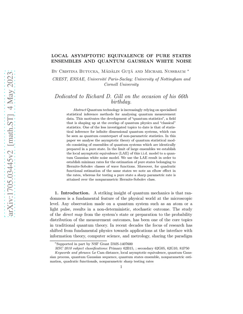 Quantum technology is increasingly relying on specialised statistical inference methods for analysing quantum measurement data. This motivates the development of "quantum statistics", a field that is shaping up at the overlap of quantum physics and "classical" statistics. One of the less investigated topics to date is that of statistical inference for infinite dimensional quantum systems, which can be seen as quantum counterpart of non-parametric statistics. In this paper we analyse the asymptotic theory of quantum statistical models consisting of ensembles of quantum systems which are identically prepared in a pure state. In the limit of large ensembles we establish the local asymptotic equivalence (LAE) of this i.i.d. model to a quantum Gaussian white noise model. We use the LAE result in order to establish minimax rates for the estimation of pure states belonging to Hermite-Sobolev classes of wave functions. Moreover, for quadratic functional estimation of the same states we note an elbow effect in the rates, whereas for testing a pure state a sharp parametric rate is attained over the nonparametric Hermite-Sobolev class.