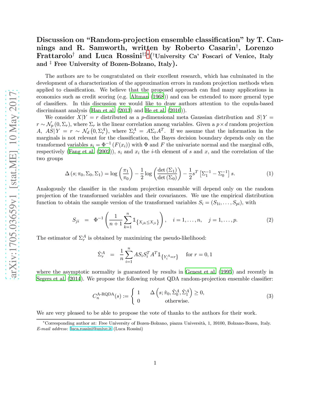 Discussion on "Random-projection ensemble classification" by T. Cannings and R. Samworth. We believe that the proposed approach can find many applications in economics such as credit scoring (e.g. Altman (1968)) and can be extended to more general type of classifiers. In this discussion we would like to draw authors attention to the copula-based discriminant analysis (Han et al. (2013) and He et al. (2016)).