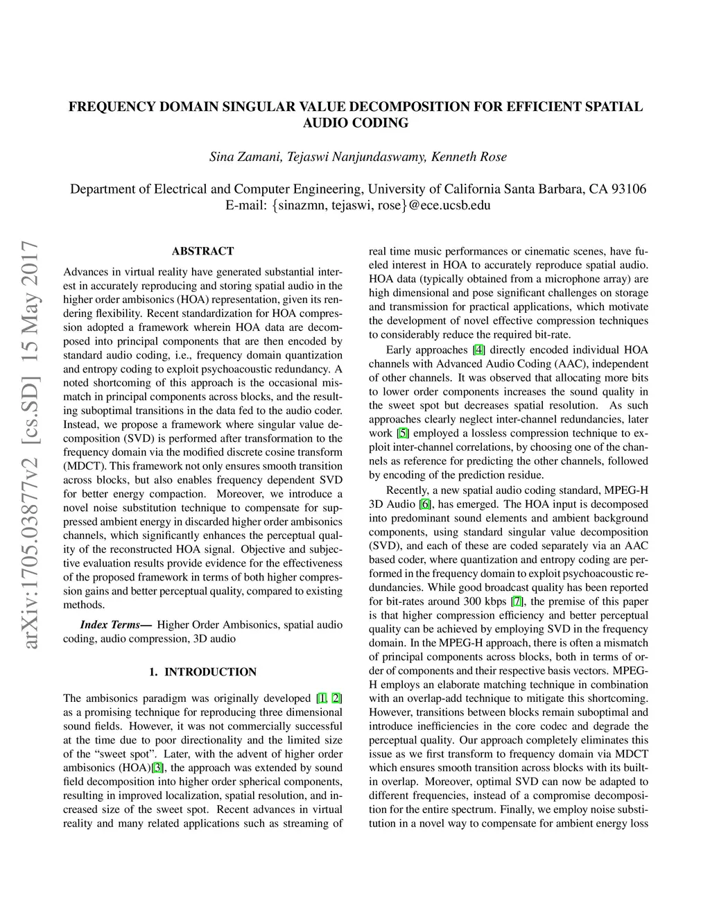 Advances in virtual reality have generated substantial interest in accurately reproducing and storing spatial audio in the higher order ambisonics (HOA) representation, given its rendering flexibility. Recent standardization for HOA compression adopted a framework wherein HOA data are decomposed into principal components that are then encoded by standard audio coding, i.e., frequency domain quantization and entropy coding to exploit psychoacoustic redundancy. A noted shortcoming of this approach is the occasional mismatch in principal components across blocks, and the resulting suboptimal transitions in the data fed to the audio coder. Instead, we propose a framework where singular value decomposition (SVD) is performed after transformation to the frequency domain via the modified discrete cosine transform (MDCT). This framework not only ensures smooth transition across blocks, but also enables frequency dependent SVD for better energy compaction. Moreover, we introduce a novel noise substitution technique to compensate for suppressed ambient energy in discarded higher order ambisonics channels, which significantly enhances the perceptual quality of the reconstructed HOA signal. Objective and subjective evaluation results provide evidence for the effectiveness of the proposed framework in terms of both higher compression gains and better perceptual quality, compared to existing methods.