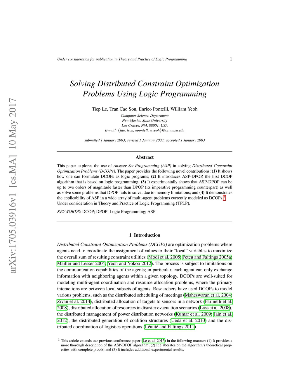 This paper explores the use of Answer Set Programming (ASP) in solving Distributed Constraint Optimization Problems (DCOPs). The paper provides the following novel contributions: (1) It shows how one can formulate DCOPs as logic programs; (2) It introduces ASP-DPOP, the first DCOP algorithm that is based on logic programming; (3) It experimentally shows that ASP-DPOP can be up to two orders of magnitude faster than DPOP (its imperative programming counterpart) as well as solve some problems that DPOP fails to solve, due to memory limitations; and (4) It demonstrates the applicability of ASP in a wide array of multi-agent problems currently modeled as DCOPs. Under consideration in Theory and Practice of Logic Programming (TPLP).
