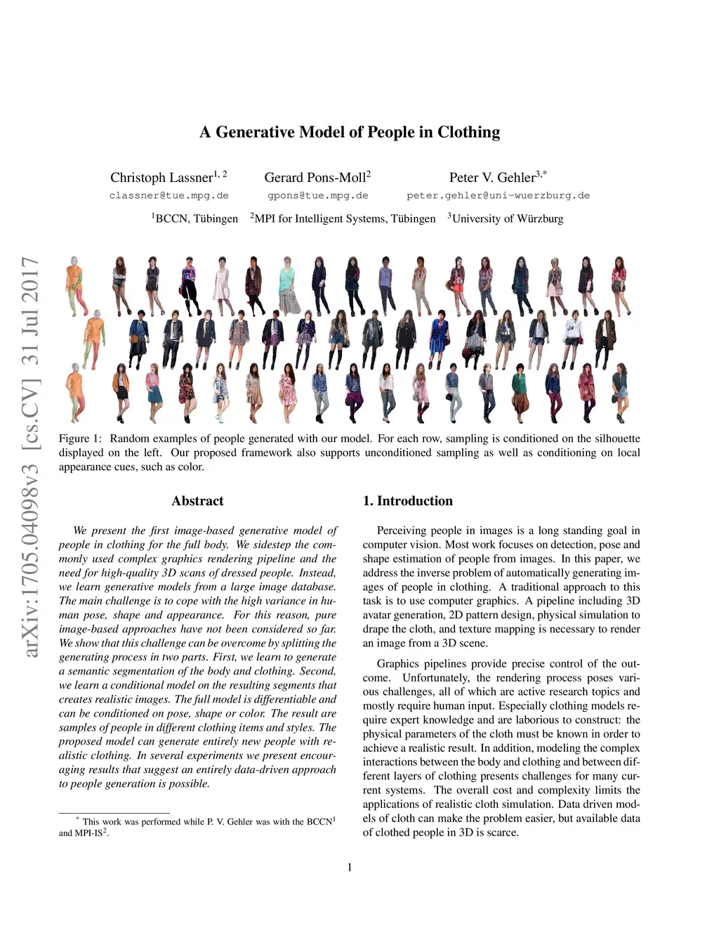 We present the first image-based generative model of people in clothing in a full-body setting. We sidestep the commonly used complex graphics rendering pipeline and the need for high-quality 3D scans of dressed people. Instead, we learn generative models from a large image database. The main challenge is to cope with the high variance in human pose, shape and appearance. For this reason, pure image-based approaches have not been considered so far. We show that this challenge can be overcome by splitting the generating process in two parts. First, we learn to generate a semantic segmentation of the body and clothing. Second, we learn a conditional model on the resulting segments that creates realistic images. The full model is differentiable and can be conditioned on pose, shape or color. The result are samples of people in different clothing items and styles. The proposed model can generate entirely new people with realistic clothing. In several experiments we present encouraging results that suggest an entirely data-driven approach to people generation is possible.