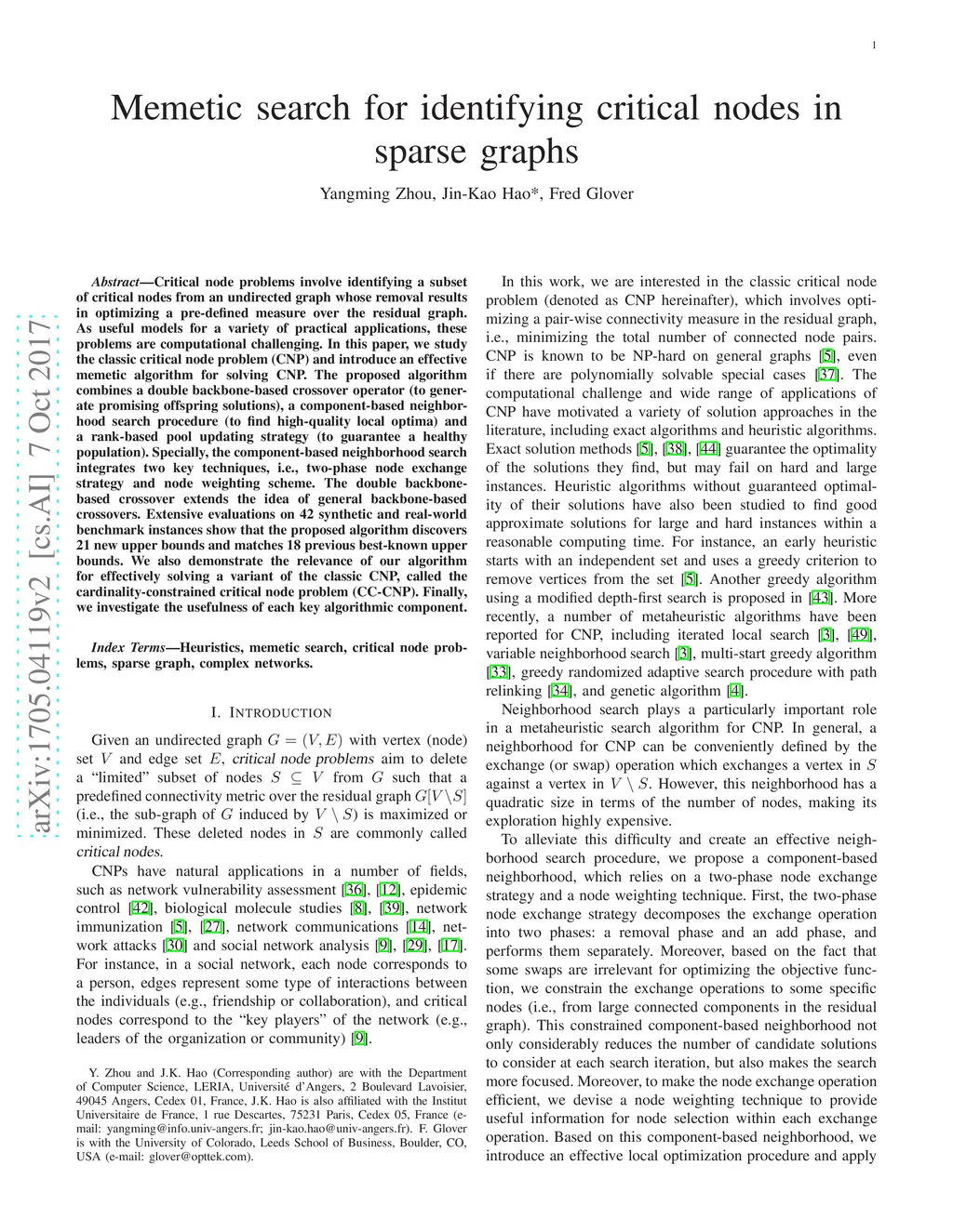Memetic search for identifying critical nodes in sparse graphs