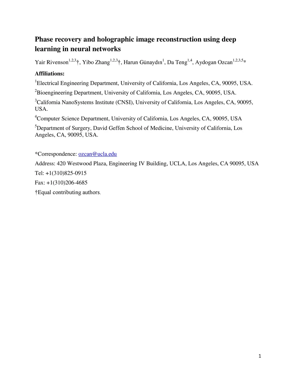 Phase recovery and holographic image reconstruction using deep learning