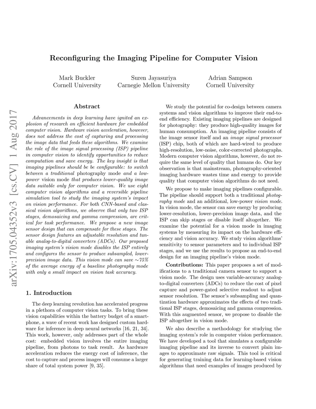 Advancements in deep learning have ignited an explosion of research on efficient hardware for embedded computer vision. Hardware vision acceleration, however, does not address the cost of capturing and processing the image data that feeds these algorithms. We examine the role of the image signal processing (ISP) pipeline in computer vision to identify opportunities to reduce computation and save energy. The key insight is that imaging pipelines should be designed to be configurable: to switch between a traditional photography mode and a low-power vision mode that produces lower-quality image data suitable only for computer vision. We use eight computer vision algorithms and a reversible pipeline simulation tool to study the imaging system's impact on vision performance. For both CNN-based and classical vision algorithms, we observe that only two ISP stages, demosaicing and gamma compression, are critical for task performance. We propose a new image sensor design that can compensate for skipping these stages. The sensor design features an adjustable resolution and tunable analog-to-digital converters (ADCs). Our proposed imaging system's vision mode disables the ISP entirely and configures the sensor to produce subsampled, lower-precision image data. This vision mode can save ~75% of the average energy of a baseline photography mode while having only a small impact on vision task accuracy.