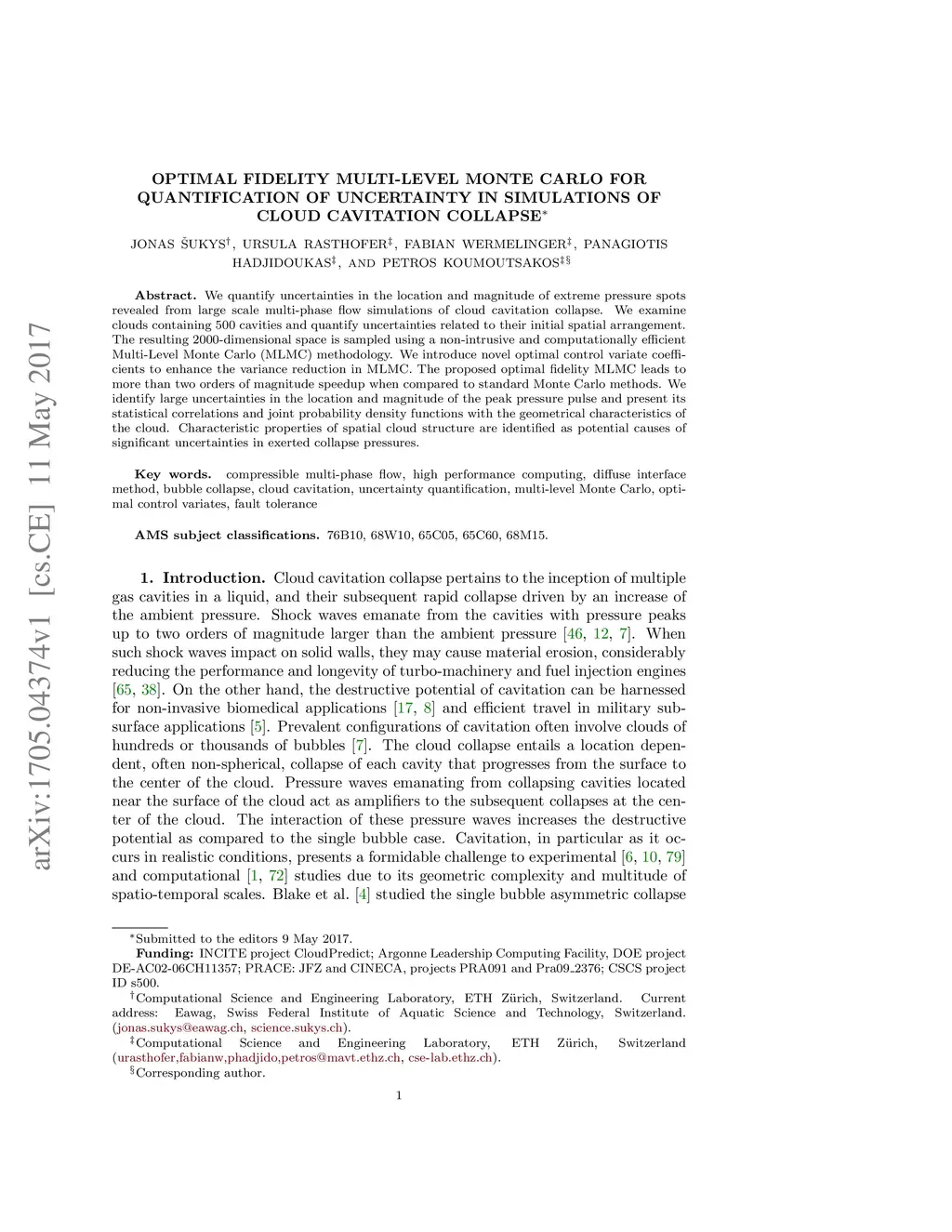 We quantify uncertainties in the location and magnitude of extreme pressure spots revealed from large scale multi-phase flow simulations of cloud cavitation collapse. We examine clouds containing 500 cavities and quantify uncertainties related to their initial spatial arrangement. The resulting 2000-dimensional space is sampled using a non-intrusive and computationally efficient Multi-Level Monte Carlo (MLMC) methodology. We introduce novel optimal control variate coefficients to enhance the variance reduction in MLMC. The proposed optimal fidelity MLMC leads to more than two orders of magnitude speedup when compared to standard Monte Carlo methods. We identify large uncertainties in the location and magnitude of the peak pressure pulse and present its statistical correlations and joint probability density functions with the geometrical characteristics of the cloud. Characteristic properties of spatial cloud structure are identified as potential causes of significant uncertainties in exerted collapse pressures.