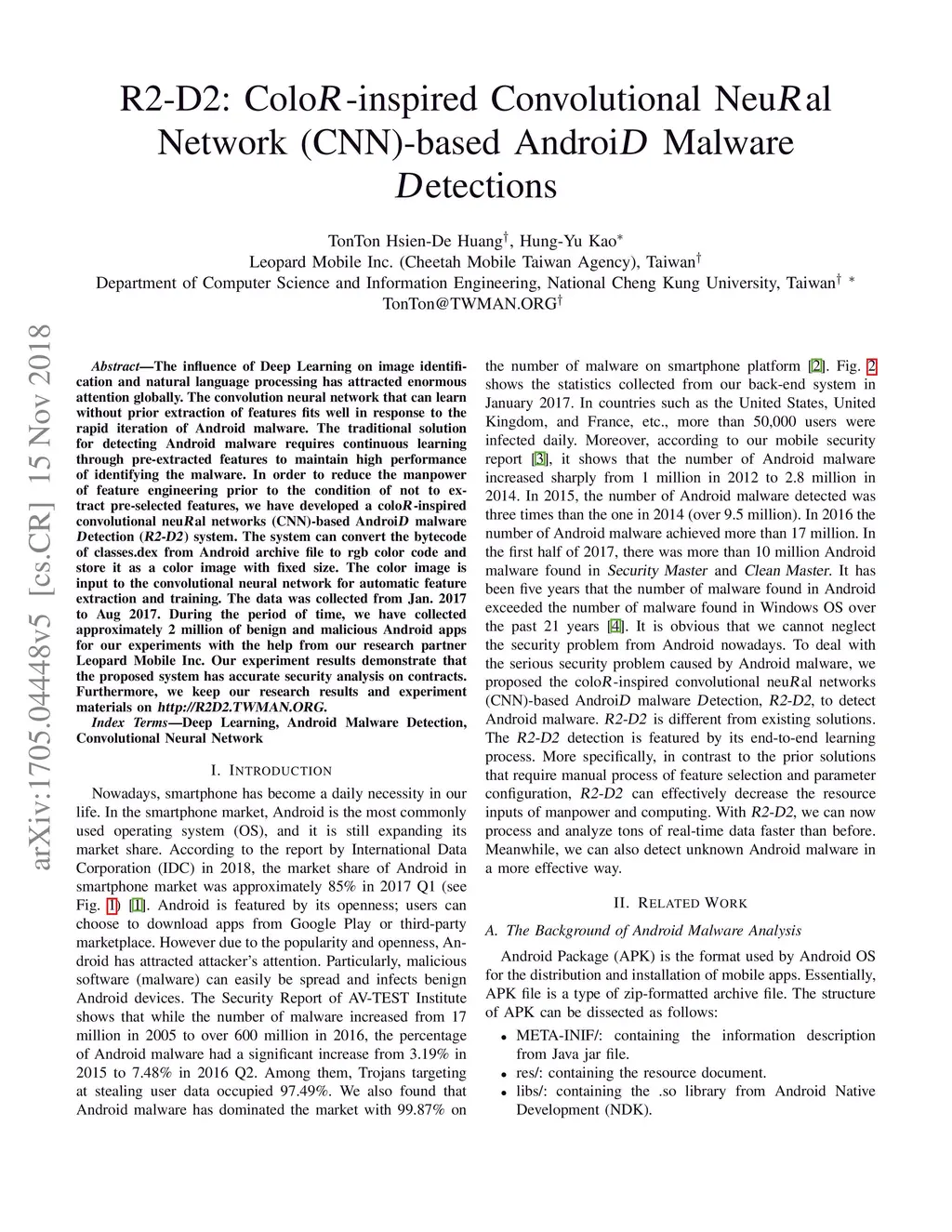 The influence of Deep Learning on image identification and natural language processing has attracted enormous attention globally. The convolution neural network that can learn without prior extraction of features fits well in response to the rapid iteration of Android malware. The traditional solution for detecting Android malware requires continuous learning through pre-extracted features to maintain high performance of identifying the malware. In order to reduce the manpower of feature engineering prior to the condition of not to extract pre-selected features, we have developed a coloR-inspired convolutional neuRal networks (CNN)-based AndroiD malware Detection (R2-D2) system. The system can convert the bytecode of classes.dex from Android archive file to rgb color code and store it as a color image with fixed size. The color image is input to the convolutional neural network for automatic feature extraction and training. The data was collected from Jan. 2017 to Aug 2017. During the period of time, we have collected approximately 2 million of benign and malicious Android apps for our experiments with the help from our research partner Leopard Mobile Inc. Our experiment results demonstrate that the proposed system has accurate security analysis on contracts. Furthermore, we keep our research results and experiment materials on http://R2D2.TWMAN.ORG.
