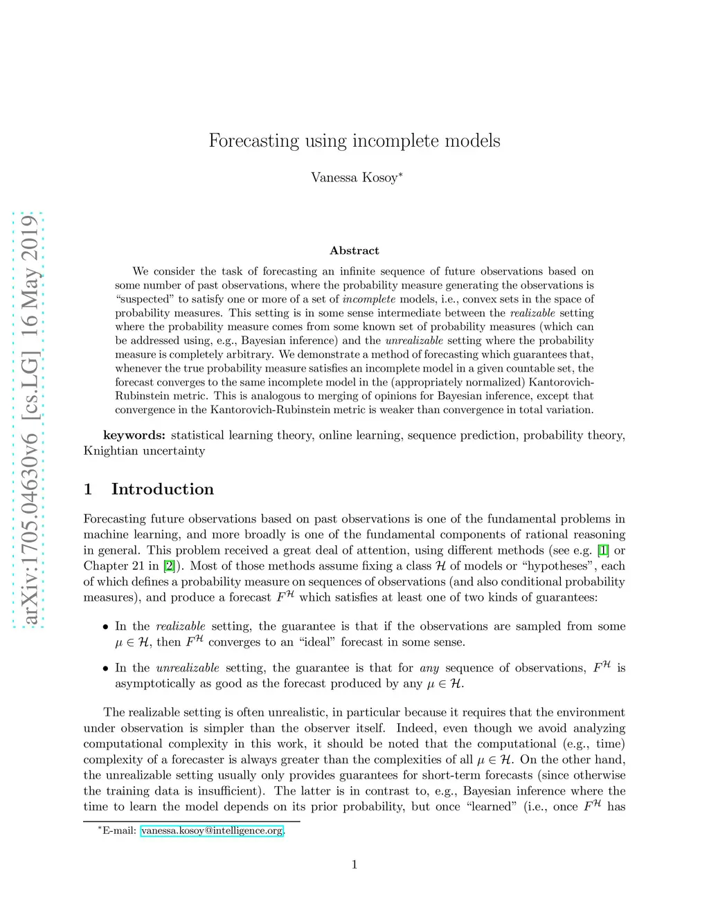 We consider the task of forecasting an infinite sequence of future observations based on some number of past observations, where the probability measure generating the observations is "suspected" to satisfy one or more of a set of incomplete models, i.e. convex sets in the space of probability measures. This setting is in some sense intermediate between the realizable setting where the probability measure comes from some known set of probability measures (which can be addressed using e.g. Bayesian inference) and the unrealizable setting where the probability measure is completely arbitrary. We demonstrate a method of forecasting which guarantees that, whenever the true probability measure satisfies an incomplete model in a given countable set, the forecast converges to the same incomplete model in the (appropriately normalized) Kantorovich-Rubinstein metric. This is analogous to merging of opinions for Bayesian inference, except that convergence in the Kantorovich-Rubinstein metric is weaker than convergence in total variation.