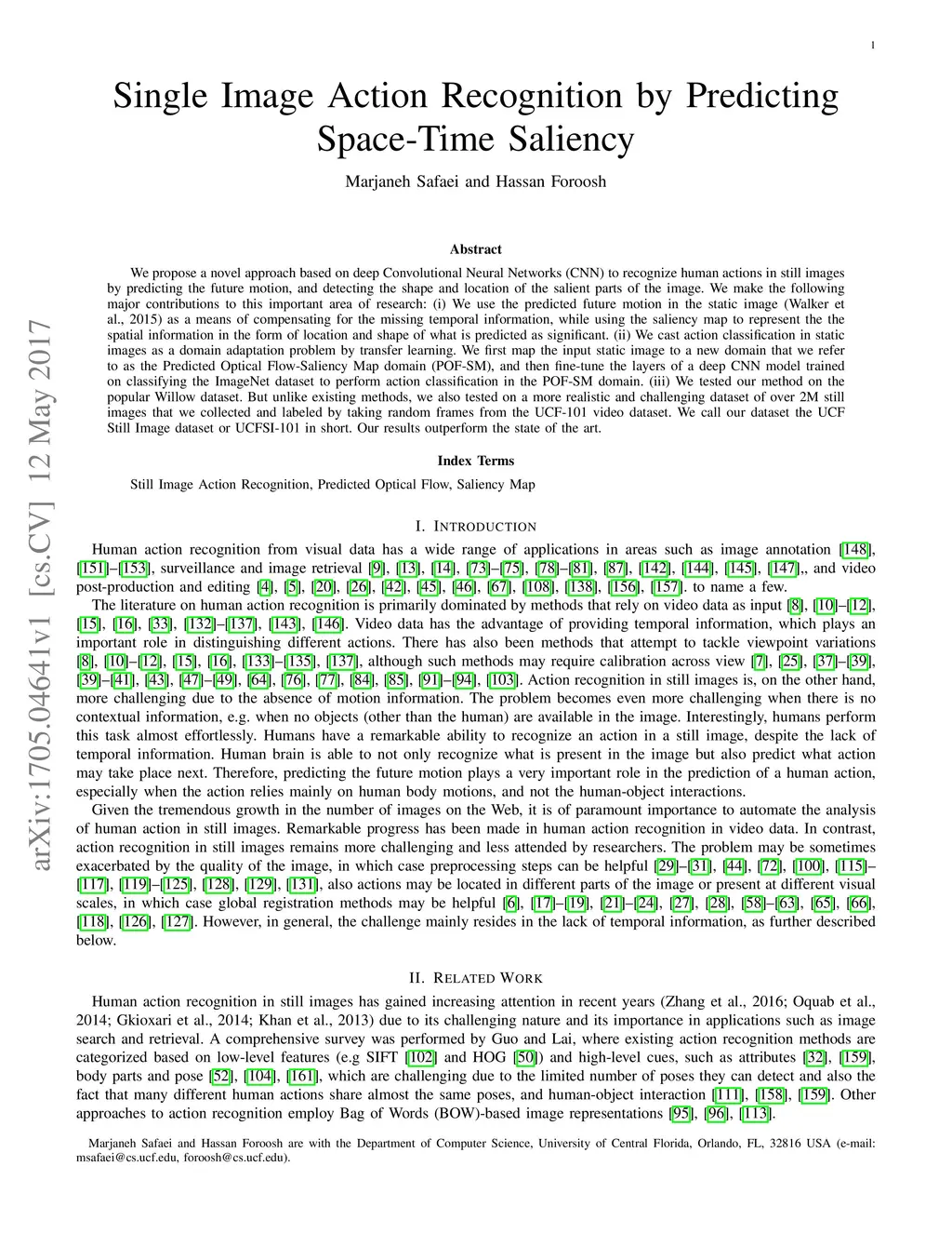 We propose a novel approach based on deep Convolutional Neural Networks (CNN) to recognize human actions in still images by predicting the future motion, and detecting the shape and location of the salient parts of the image. We make the following major contributions to this important area of research: (i) We use the predicted future motion in the static image (Walker et al., 2015) as a means of compensating for the missing temporal information, while using the saliency map to represent the the spatial information in the form of location and shape of what is predicted as significant. (ii) We cast action classification in static images as a domain adaptation problem by transfer learning. We first map the input static image to a new domain that we refer to as the Predicted Optical Flow-Saliency Map domain (POF-SM), and then fine-tune the layers of a deep CNN model trained on classifying the ImageNet dataset to perform action classification in the POF-SM domain. (iii) We tested our method on the popular Willow dataset. But unlike existing methods, we also tested on a more realistic and challenging dataset of over 2M still images that we collected and labeled by taking random frames from the UCF-101 video dataset. We call our dataset the UCF Still Image dataset or UCFSI-101 in short. Our results outperform the state of the art.