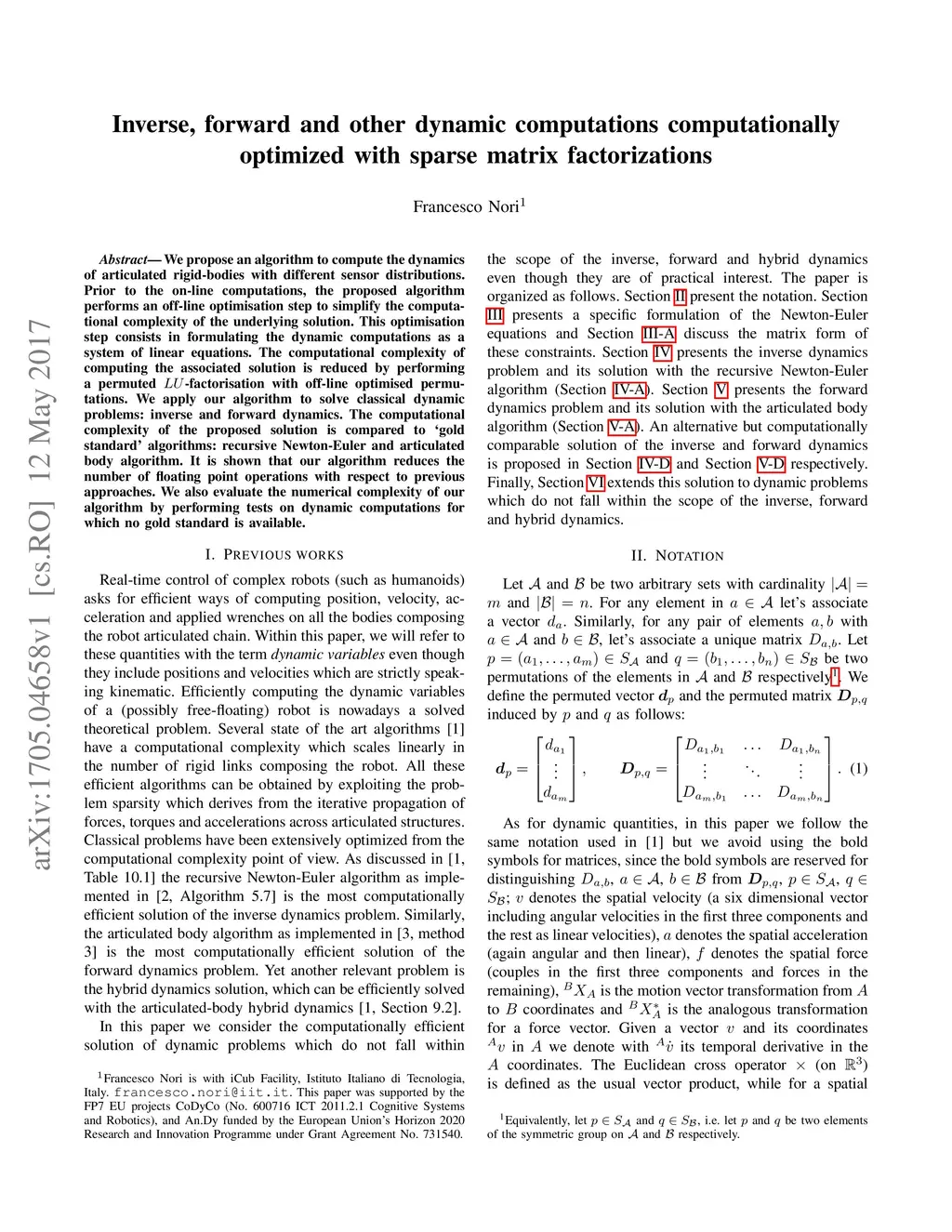 We propose an algorithm to compute the dynamics of articulated rigid-bodies with different sensor distributions. Prior to the on-line computations, the proposed algorithm performs an off-line optimisation step to simplify the computational complexity of the underlying solution. This optimisation step consists in formulating the dynamic computations as a system of linear equations. The computational complexity of computing the associated solution is reduced by performing a permuted LU-factorisation with off-line optimised permutations. We apply our algorithm to solve classical dynamic problems: inverse and forward dynamics. The computational complexity of the proposed solution is compared to `gold standard' algorithms: recursive Newton-Euler and articulated body algorithm. It is shown that our algorithm reduces the number of floating point operations with respect to previous approaches. We also evaluate the numerical complexity of our algorithm by performing tests on dynamic computations for which no gold standard is available.