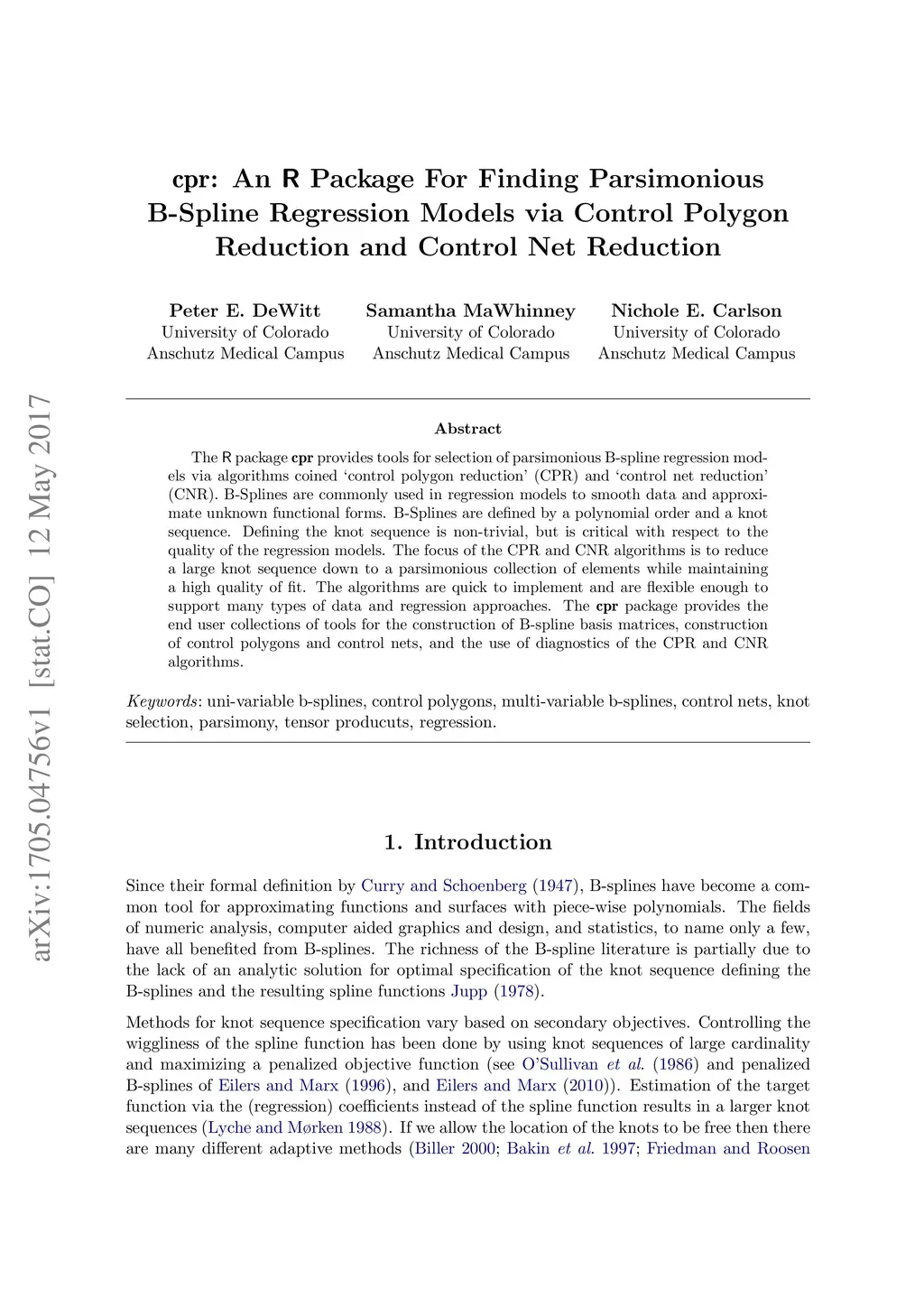 The R package cpr provides tools for selection of parsimonious B-spline regression models via algorithms coined `control polygon reduction' (CPR) and `control net reduction' (CNR). B-Splines are commonly used in regression models to smooth data and approximate unknown functional forms. B-Splines are defined by a polynomial order and a knot sequence. Defining the knot sequence is non-trivial, but is critical with respect to the quality of the regression models. The focus of the CPR and CNR algorithms is to reduce a large knot sequence down to a parsimonious collection of elements while maintaining a high quality of fit. The algorithms are quick to implement and are flexible enough to support many types of data and regression approaches. The cpr package provides the end user collections of tools for the construction of B-spline basis matrices, construction of control polygons and control nets, and the use of diagnostics of the CPR and CNR algorithms.
