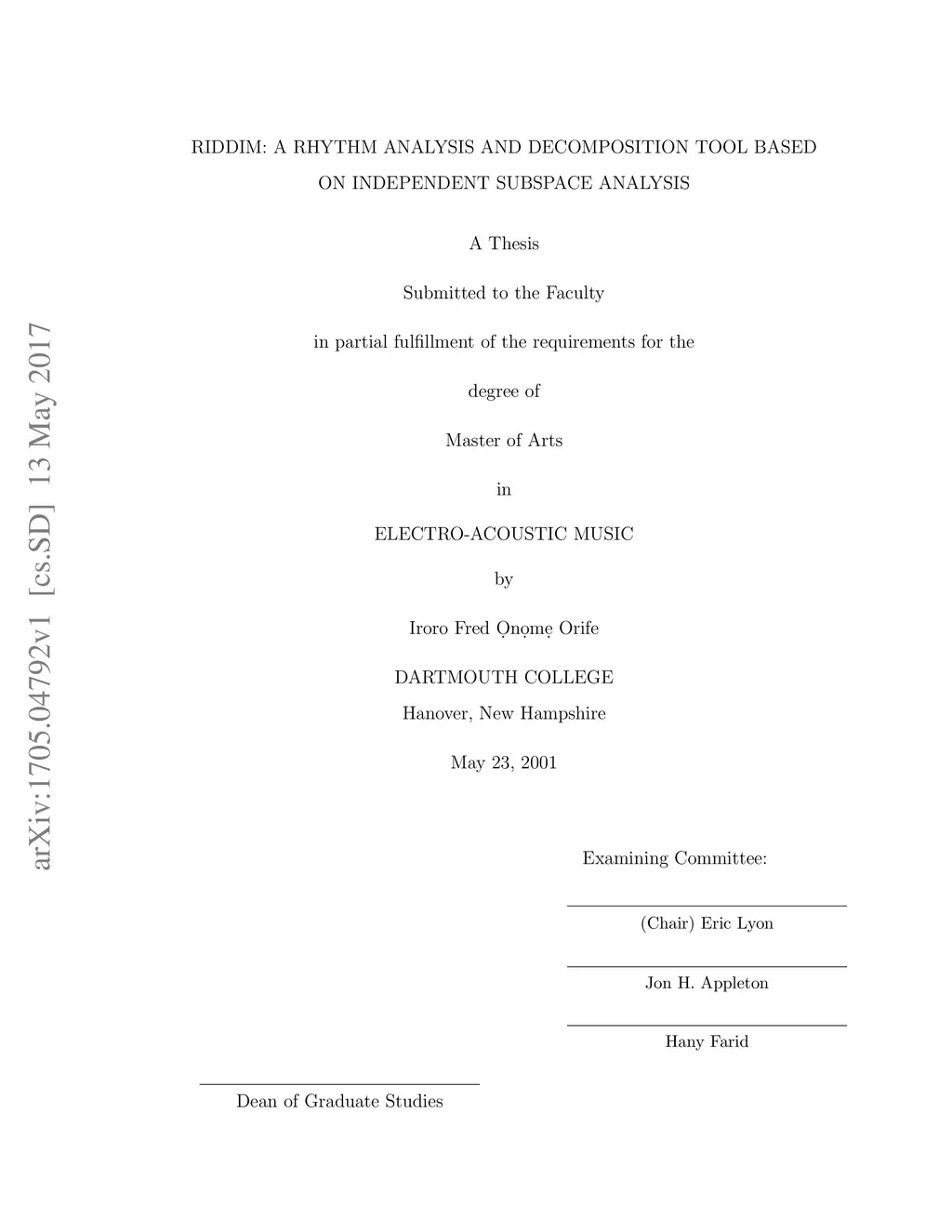The goal of this thesis was to implement a tool that, given a digital audio input, can extract and represent rhythm and musical time. The purpose of the tool is to help develop better models of rhythm for real-time computer based performance and composition. This analysis tool, Riddim, uses Independent Subspace Analysis (ISA) and a robust onset detection scheme to separate and detect salient rhythmic and timing information from different sonic sources within the input. This information is then represented in a format that can be used by a variety of algorithms that interpret timing information to infer rhythmic and musical structure. A secondary objective of this work is a "proof of concept" as a non-real-time rhythm analysis system based on ISA. This is a necessary step since ultimately it is desirable to incorporate this functionality in a real-time plug-in for live performance and improvisation.