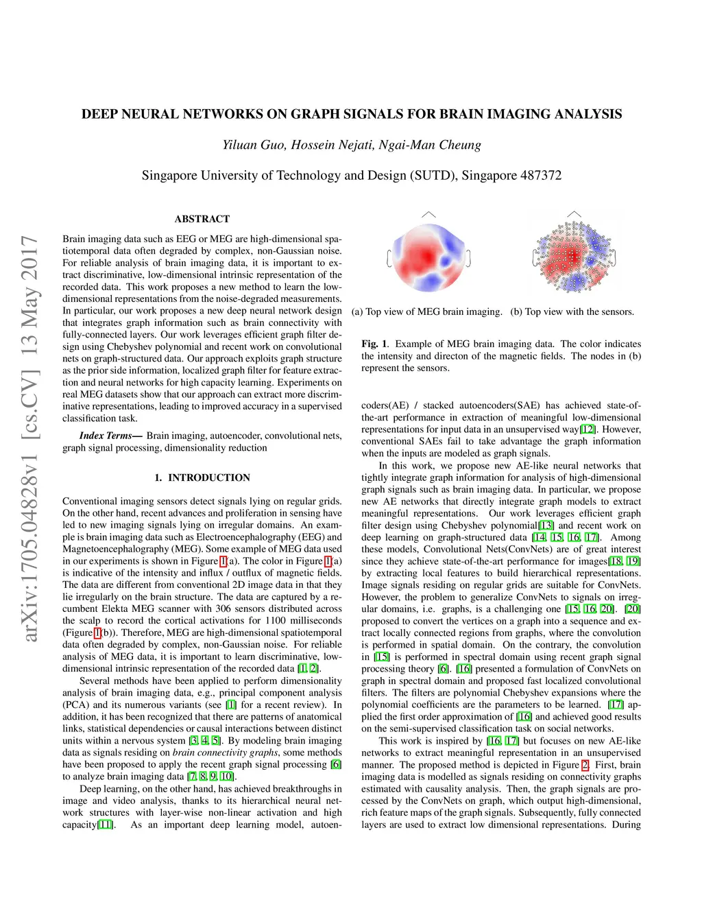 Brain imaging data such as EEG or MEG are high-dimensional spatiotemporal data often degraded by complex, non-Gaussian noise. For reliable analysis of brain imaging data, it is important to extract discriminative, low-dimensional intrinsic representation of the recorded data. This work proposes a new method to learn the low-dimensional representations from the noise-degraded measurements. In particular, our work proposes a new deep neural network design that integrates graph information such as brain connectivity with fully-connected layers. Our work leverages efficient graph filter design using Chebyshev polynomial and recent work on convolutional nets on graph-structured data. Our approach exploits graph structure as the prior side information, localized graph filter for feature extraction and neural networks for high capacity learning. Experiments on real MEG datasets show that our approach can extract more discriminative representations, leading to improved accuracy in a supervised classification task.