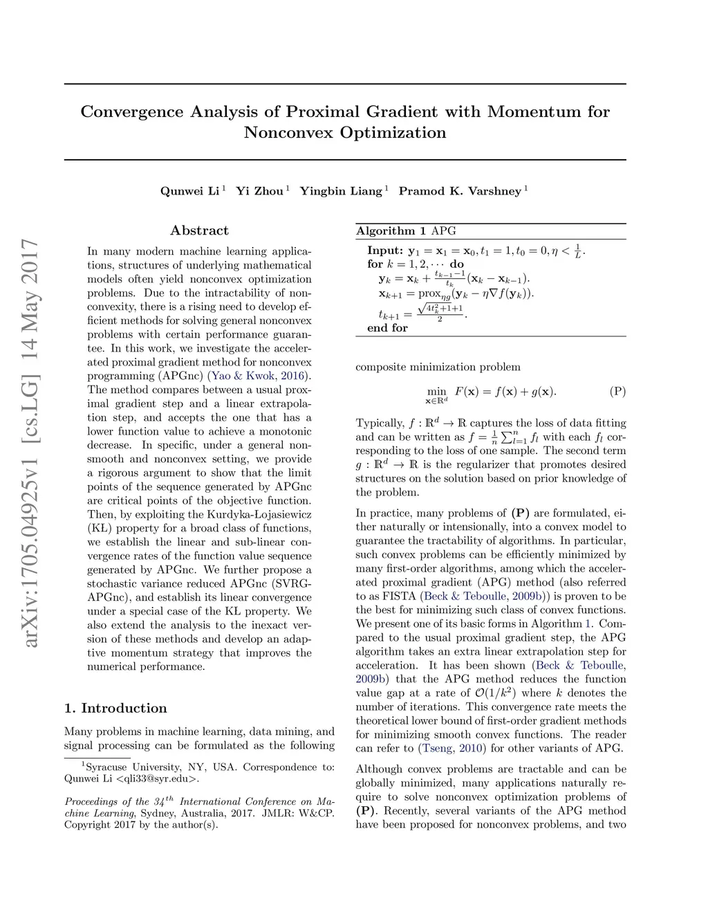 In many modern machine learning applications, structures of underlying mathematical models often yield nonconvex optimization problems. Due to the intractability of nonconvexity, there is a rising need to develop efficient methods for solving general nonconvex problems with certain performance guarantee. In this work, we investigate the accelerated proximal gradient method for nonconvex programming (APGnc). The method compares between a usual proximal gradient step and a linear extrapolation step, and accepts the one that has a lower function value to achieve a monotonic decrease. In specific, under a general nonsmooth and nonconvex setting, we provide a rigorous argument to show that the limit points of the sequence generated by APGnc are critical points of the objective function. Then, by exploiting the Kurdyka-{\L}ojasiewicz (\KL) property for a broad class of functions, we establish the linear and sub-linear convergence rates of the function value sequence generated by APGnc. We further propose a stochastic variance reduced APGnc (SVRG-APGnc), and establish its linear convergence under a special case of the \KL property. We also extend the analysis to the inexact version of these methods and develop an adaptive momentum strategy that improves the numerical performance.