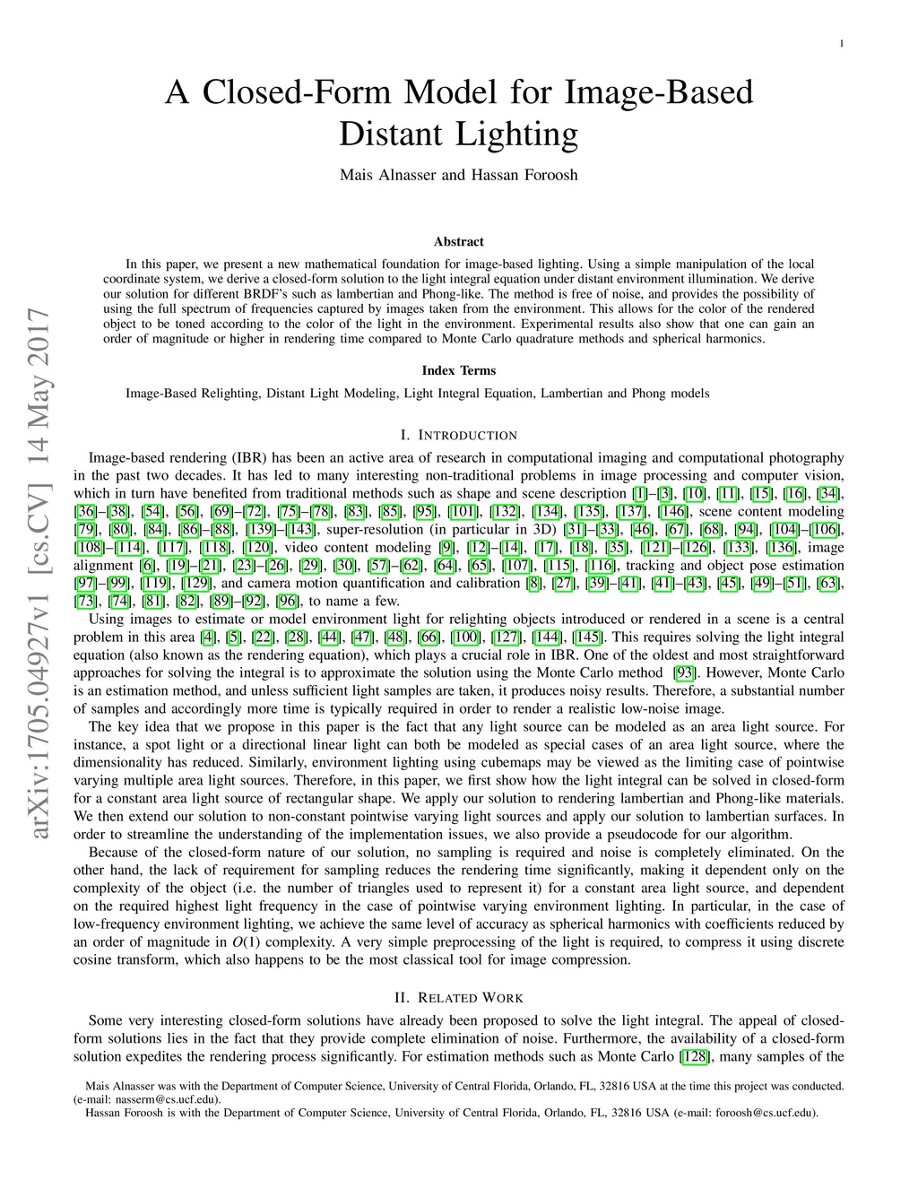 In this paper, we present a new mathematical foundation for image-based lighting. Using a simple manipulation of the local coordinate system, we derive a closed-form solution to the light integral equation under distant environment illumination. We derive our solution for different BRDF's such as lambertian and Phong-like. The method is free of noise, and provides the possibility of using the full spectrum of frequencies captured by images taken from the environment. This allows for the color of the rendered object to be toned according to the color of the light in the environment. Experimental results also show that one can gain an order of magnitude or higher in rendering time compared to Monte Carlo quadrature methods and spherical harmonics.