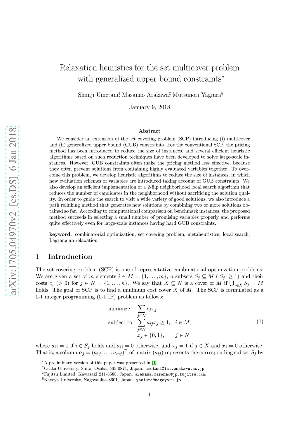 We consider an extension of the set covering problem (SCP) introducing (i)~multicover and (ii)~generalized upper bound (GUB)~constraints. For the conventional SCP, the pricing method has been introduced to reduce the size of instances, and several efficient heuristic algorithms based on such reduction techniques have been developed to solve large-scale instances. However, GUB constraints often make the pricing method less effective, because they often prevent solutions from containing highly evaluated variables together. To overcome this problem, we develop heuristic algorithms to reduce the size of instances, in which new evaluation schemes of variables are introduced taking account of GUB constraints. We also develop an efficient implementation of a 2-flip neighborhood local search algorithm that reduces the number of candidates in the neighborhood without sacrificing the solution quality. In order to guide the search to visit a wide variety of good solutions, we also introduce a path relinking method that generates new solutions by combining two or more solutions obtained so far. According to computational comparison on benchmark instances, the proposed method succeeds in selecting a small number of promising variables properly and performs quite effectively even for large-scale instances having hard GUB constraints.