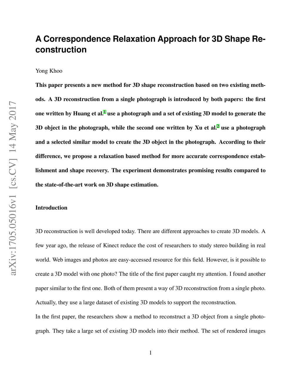 This paper presents a new method for 3D shape reconstruction based on two existing methods. A 3D reconstruction from a single photograph is introduced by both papers: the first one uses a photograph and a set of existing 3D model to generate the 3D object in the photograph, while the second one uses a photograph and a selected similar model to create the 3D object in the photograph. According to their difference, we propose a relaxation based method for more accurate correspondence establishment and shape recovery. The experiment demonstrates promising results compared to the state-of-the-art work on 3D shape estimation.
