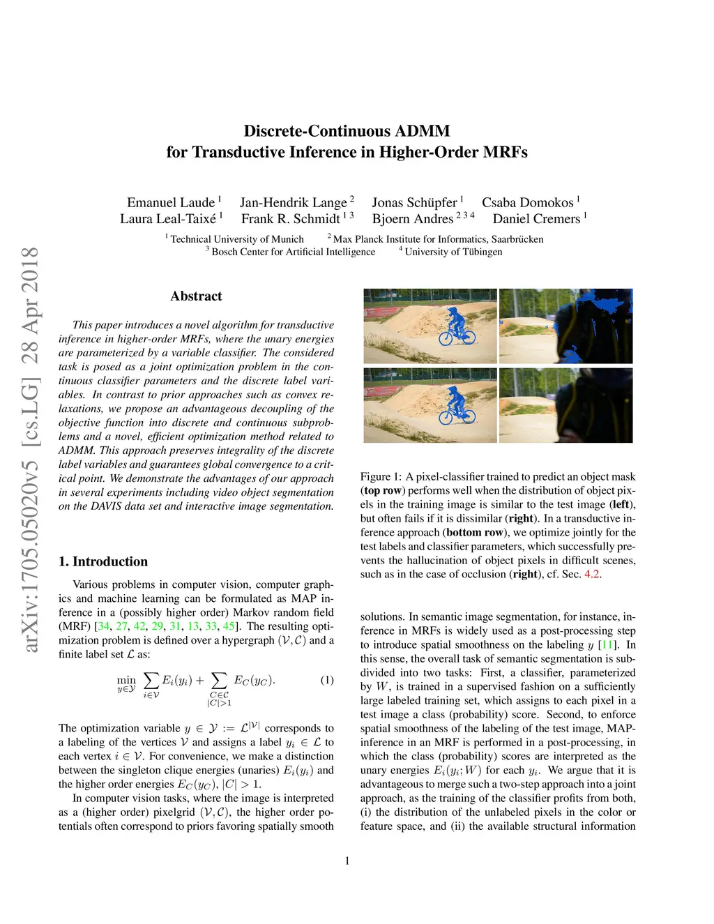 This paper introduces a novel algorithm for transductive inference in higher-order MRFs, where the unary energies are parameterized by a variable classifier. The considered task is posed as a joint optimization problem in the continuous classifier parameters and the discrete label variables. In contrast to prior approaches such as convex relaxations, we propose an advantageous decoupling of the objective function into discrete and continuous subproblems and a novel, efficient optimization method related to ADMM. This approach preserves integrality of the discrete label variables and guarantees global convergence to a critical point. We demonstrate the advantages of our approach in several experiments including video object segmentation on the DAVIS data set and interactive image segmentation.