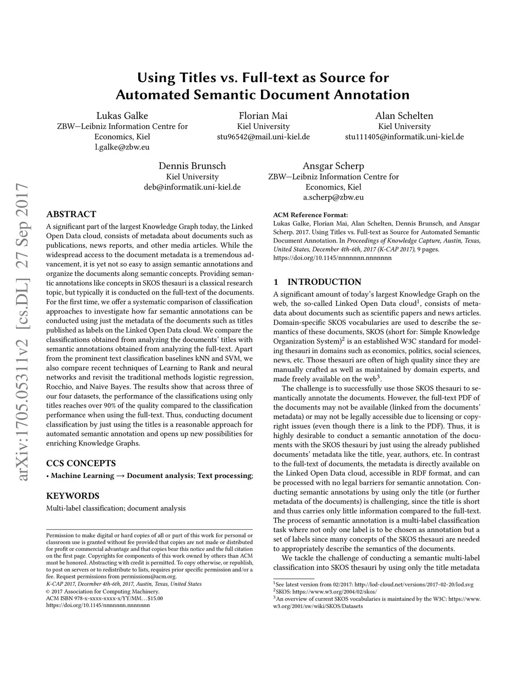 A significant part of the largest Knowledge Graph today, the Linked Open Data cloud, consists of metadata about documents such as publications, news reports, and other media articles. While the widespread access to the document metadata is a tremendous advancement, it is yet not so easy to assign semantic annotations and organize the documents along semantic concepts. Providing semantic annotations like concepts in SKOS thesauri is a classical research topic, but typically it is conducted on the full-text of the documents. For the first time, we offer a systematic comparison of classification approaches to investigate how far semantic annotations can be conducted using just the metadata of the documents such as titles published as labels on the Linked Open Data cloud. We compare the classifications obtained from analyzing the documents' titles with semantic annotations obtained from analyzing the full-text. Apart from the prominent text classification baselines kNN and SVM, we also compare recent techniques of Learning to Rank and neural networks and revisit the traditional methods logistic regression, Rocchio, and Naive Bayes. The results show that across three of our four datasets, the performance of the classifications using only titles reaches over 90% of the quality compared to the classification performance when using the full-text. Thus, conducting document classification by just using the titles is a reasonable approach for automated semantic annotation and opens up new possibilities for enriching Knowledge Graphs.