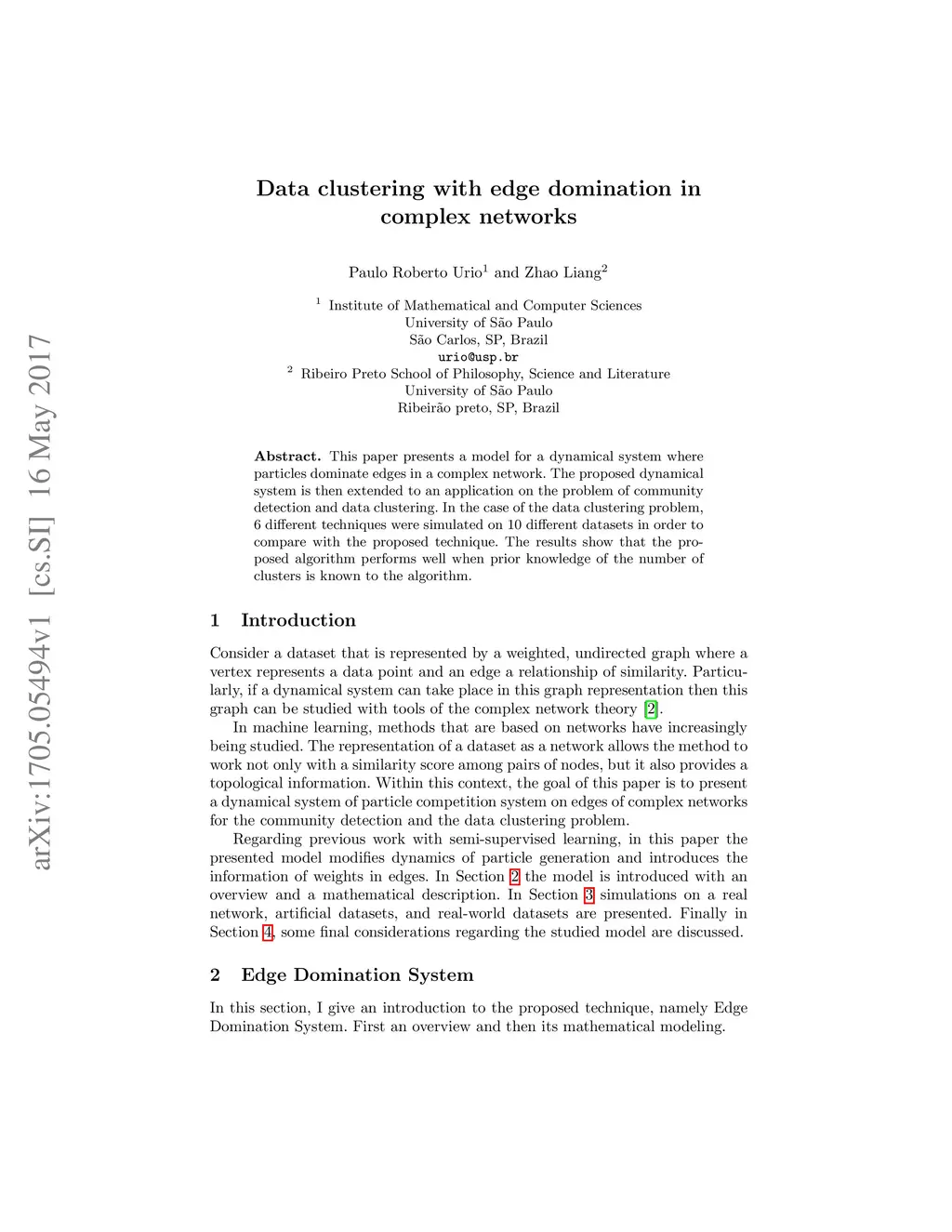 This paper presents a model for a dynamical system where particles dominate edges in a complex network. The proposed dynamical system is then extended to an application on the problem of community detection and data clustering. In the case of the data clustering problem, 6 different techniques were simulated on 10 different datasets in order to compare with the proposed technique. The results show that the proposed algorithm performs well when prior knowledge of the number of clusters is known to the algorithm.