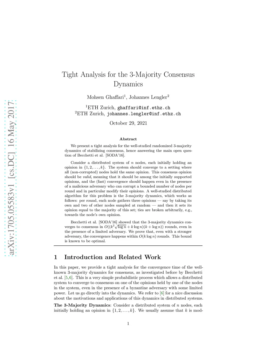 We present a tight analysis for the well-studied randomized 3-majority dynamics of stabilizing consensus, hence answering the main open question of Becchetti et al. [SODA'16]. Consider a distributed system of n nodes, each initially holding an opinion in {1, 2, ..., k}. The system should converge to a setting where all (non-corrupted) nodes hold the same opinion. This consensus opinion should be \emph{valid}, meaning that it should be among the initially supported opinions, and the (fast) convergence should happen even in the presence of a malicious adversary who can corrupt a bounded number of nodes per round and in particular modify their opinions. A well-studied distributed algorithm for this problem is the 3-majority dynamics, which works as follows: per round, each node gathers three opinions --- say by taking its own and two of other nodes sampled at random --- and then it sets its opinion equal to the majority of this set; ties are broken arbitrarily, e.g., towards the node's own opinion. Becchetti et al. [SODA'16] showed that the 3-majority dynamics converges to consensus in O((k^2\sqrt{\log n} + k\log n)(k+\log n)) rounds, even in the presence of a limited adversary. We prove that, even with a stronger adversary, the convergence happens within O(k\log n) rounds. This bound is known to be optimal.