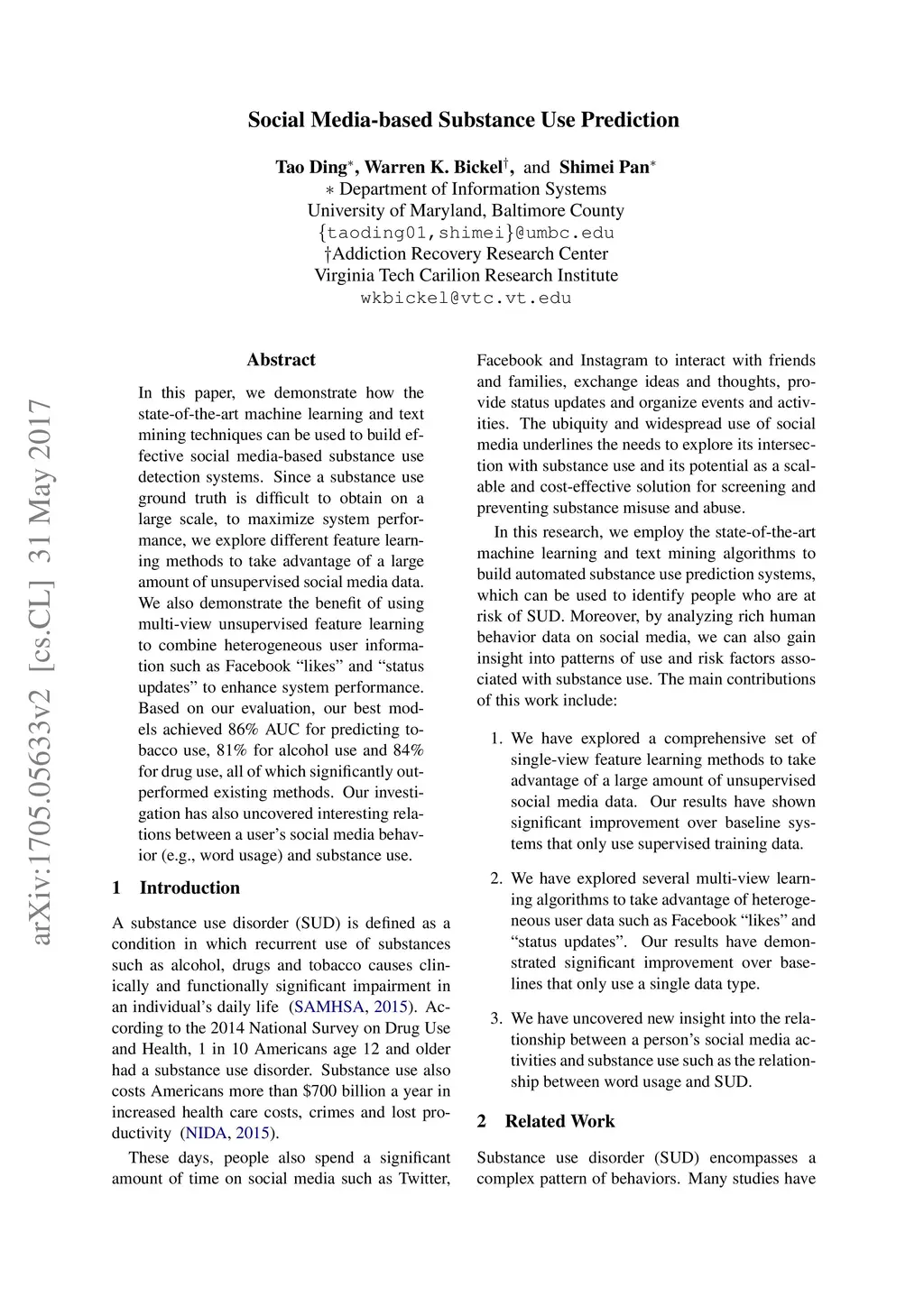 In this paper, we demonstrate how the state-of-the-art machine learning and text mining techniques can be used to build effective social media-based substance use detection systems. Since a substance use ground truth is difficult to obtain on a large scale, to maximize system performance, we explore different feature learning methods to take advantage of a large amount of unsupervised social media data. We also demonstrate the benefit of using multi-view unsupervised feature learning to combine heterogeneous user information such as Facebook `"likes" and "status updates" to enhance system performance. Based on our evaluation, our best models achieved 86% AUC for predicting tobacco use, 81% for alcohol use and 84% for drug use, all of which significantly outperformed existing methods. Our investigation has also uncovered interesting relations between a user's social media behavior (e.g., word usage) and substance use.