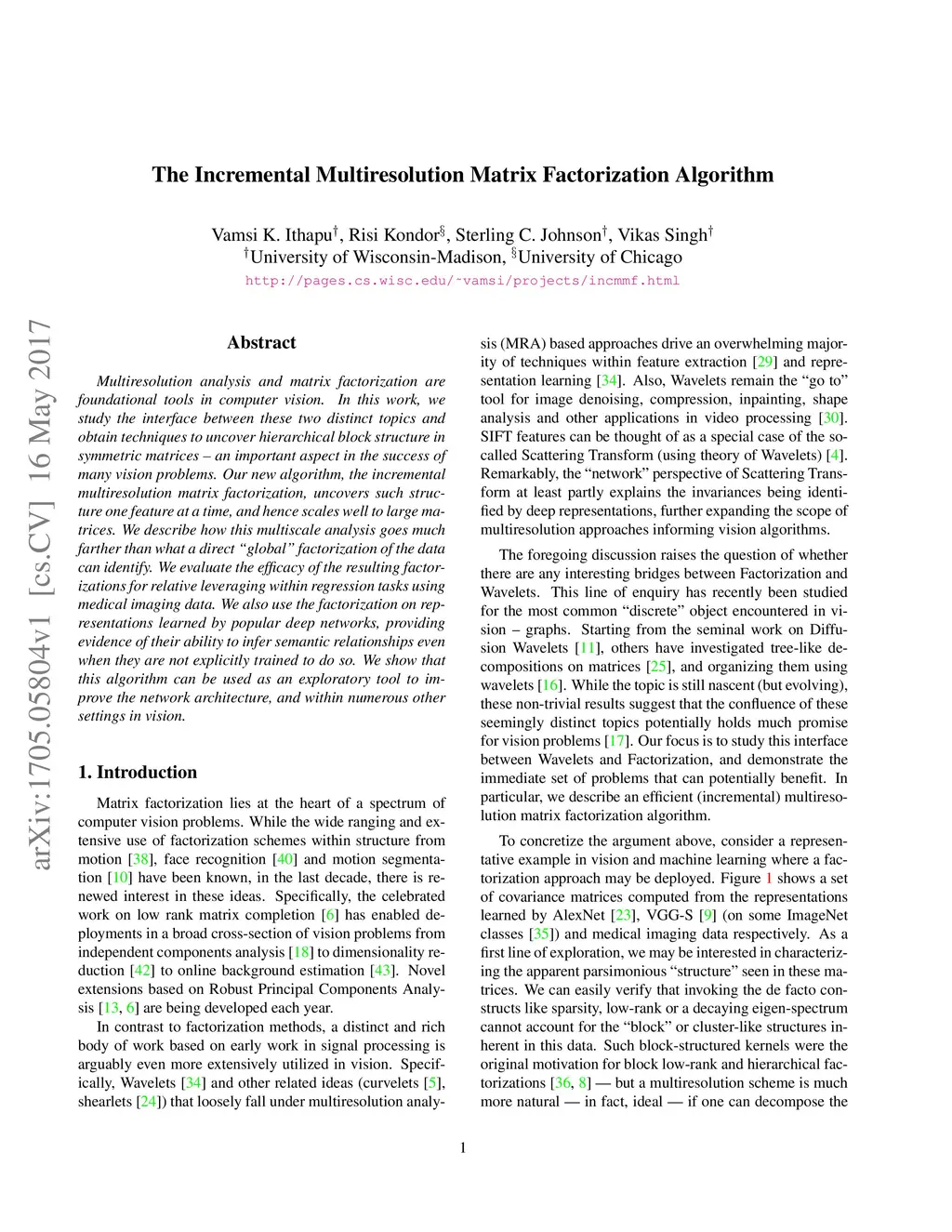 Multiresolution analysis and matrix factorization are foundational tools in computer vision. In this work, we study the interface between these two distinct topics and obtain techniques to uncover hierarchical block structure in symmetric matrices -- an important aspect in the success of many vision problems. Our new algorithm, the incremental multiresolution matrix factorization, uncovers such structure one feature at a time, and hence scales well to large matrices. We describe how this multiscale analysis goes much farther than what a direct global factorization of the data can identify. We evaluate the efficacy of the resulting factorizations for relative leveraging within regression tasks using medical imaging data. We also use the factorization on representations learned by popular deep networks, providing evidence of their ability to infer semantic relationships even when they are not explicitly trained to do so. We show that this algorithm can be used as an exploratory tool to improve the network architecture, and within numerous other settings in vision.