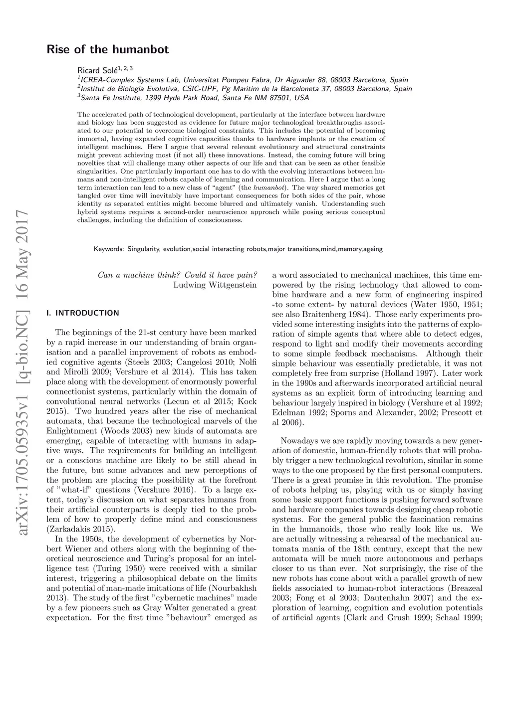 The accelerated path of technological development, particularly at the interface between hardware and biology has been suggested as evidence for future major technological breakthroughs associated to our potential to overcome biological constraints. This includes the potential of becoming immortal, having expanded cognitive capacities thanks to hardware implants or the creation of intelligent machines. Here I argue that several relevant evolutionary and structural constraints might prevent achieving most (if not all) these innovations. Instead, the coming future will bring novelties that will challenge many other aspects of our life and that can be seen as other feasible singularities. One particularly important one has to do with the evolving interactions between humans and non-intelligent robots capable of learning and communication. Here I argue that a long term interaction can lead to a new class of "agent" (the humanbot). The way shared memories get tangled over time will inevitably have important consequences for both sides of the pair, whose identity as separated entities might become blurred and ultimately vanish. Understanding such hybrid systems requires a second-order neuroscience approach while posing serious conceptual challenges, including the definition of consciousness.