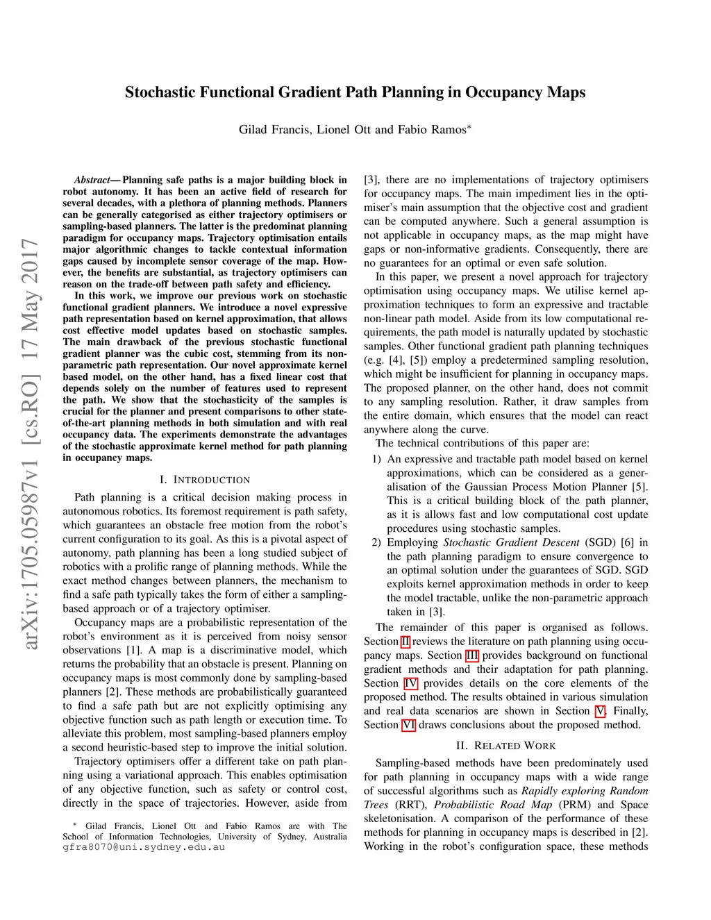 Planning safe paths is a major building block in robot autonomy. It has been an active field of research for several decades, with a plethora of planning methods. Planners can be generally categorised as either trajectory optimisers or sampling-based planners. The latter is the predominant planning paradigm for occupancy maps. Trajectory optimisation entails major algorithmic changes to tackle contextual information gaps caused by incomplete sensor coverage of the map. However, the benefits are substantial, as trajectory optimisers can reason on the trade-off between path safety and efficiency. In this work, we improve our previous work on stochastic functional gradient planners. We introduce a novel expressive path representation based on kernel approximation, that allows cost effective model updates based on stochastic samples. The main drawback of the previous stochastic functional gradient planner was the cubic cost, stemming from its non-parametric path representation. Our novel approximate kernel based model, on the other hand, has a fixed linear cost that depends solely on the number of features used to represent the path. We show that the stochasticity of the samples is crucial for the planner and present comparisons to other state-of-the-art planning methods in both simulation and with real occupancy data. The experiments demonstrate the advantages of the stochastic approximate kernel method for path planning in occupancy maps.
