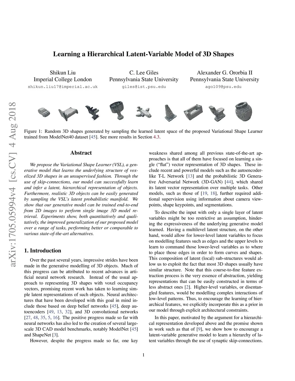 We propose the Variational Shape Learner (VSL), a hierarchical latent-variable model for 3D shape learning. VSL employs an unsupervised, variational approach to the inference and learning of the underlying structure of voxelized 3D shapes. Our model successfully learns 3D shapes via a hierarchical latent representation, made possible through the use of skip-connections. Realistic 3D objects can be generated by sampling its latent probabilistic manifold. We show that our inference and generative model can be trained end-to-end from 2D images to perform single image 3D model retrieval. Experiments show the improved performance of our model both quantitatively and qualitatively over a range of tasks.
