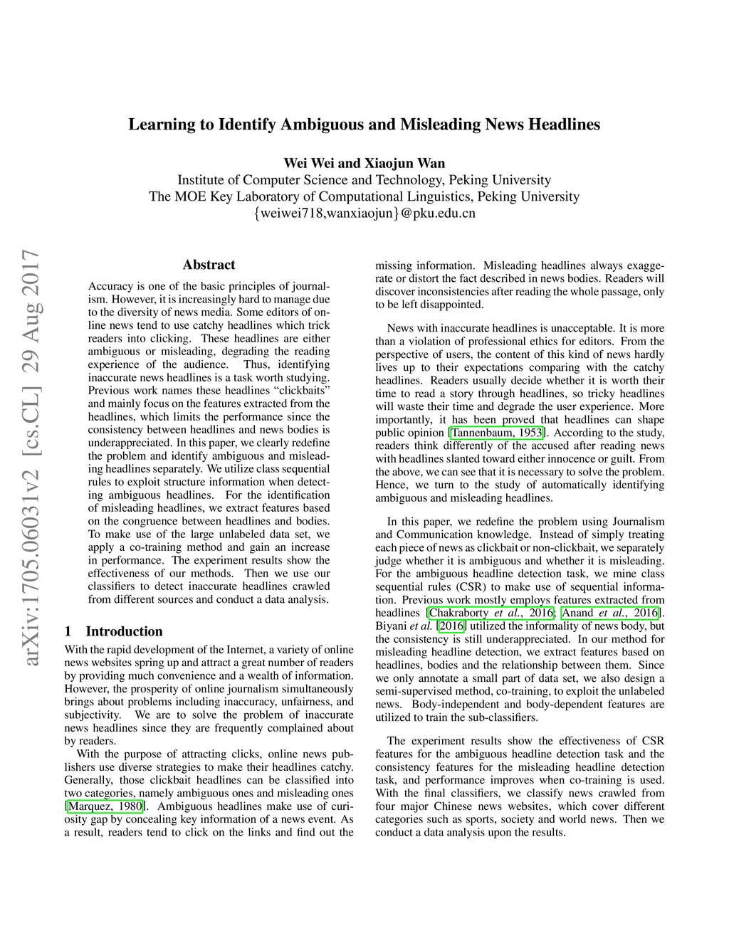 Accuracy is one of the basic principles of journalism. However, it is increasingly hard to manage due to the diversity of news media. Some editors of online news tend to use catchy headlines which trick readers into clicking. These headlines are either ambiguous or misleading, degrading the reading experience of the audience. Thus, identifying inaccurate news headlines is a task worth studying. Previous work names these headlines "clickbaits" and mainly focus on the features extracted from the headlines, which limits the performance since the consistency between headlines and news bodies is underappreciated. In this paper, we clearly redefine the problem and identify ambiguous and misleading headlines separately. We utilize class sequential rules to exploit structure information when detecting ambiguous headlines. For the identification of misleading headlines, we extract features based on the congruence between headlines and bodies. To make use of the large unlabeled data set, we apply a co-training method and gain an increase in performance. The experiment results show the effectiveness of our methods. Then we use our classifiers to detect inaccurate headlines crawled from different sources and conduct a data analysis.